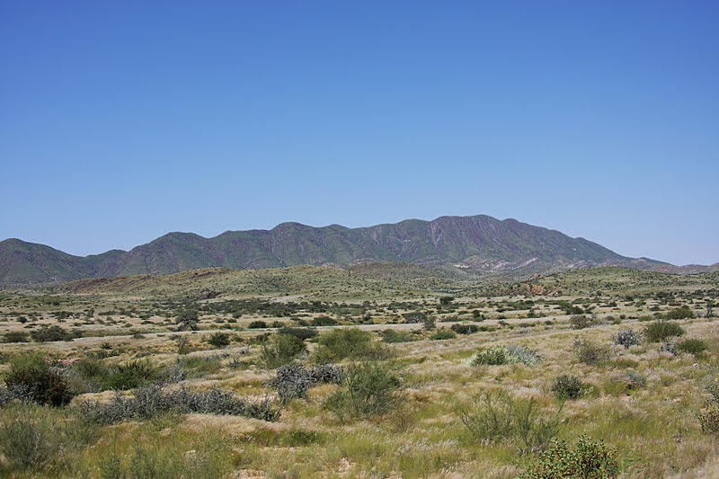 Unsere erste Pause aber machen wir erst weit nach Usakos, als wir einen besonders schönen Blick auf die Spitzkuppe haben. Leider ist es ein wenig diesig und auch die schon recht hoch stehende Sonne ist einem fotografischen Meisterwerk nicht gerade zuträglich. Trotzdem oder, besser gesagt, gerade deswegen hat das Ganze aber einen sehr besonderen Reiz. Der dunstig-blaue Himmel, der pastellblau-rötliche Berg, der 700 Meter aus der Ebene ragt und die weißen Ähren des hüfthohen Grases wirken wie ein Compton-Gemälde. Doch das „Matterhorn Namibias“ ist bei weitem nicht das einzige, was es zu bestaunen gibt: winzige Blümchen bedecken den Boden zwischen dem erstaunlich licht stehenden Gras, sich paarende Schrecken, die perfekt getarnt sind, sorgen für Nachwuchs, kleine sandfarbene Agamen huschen geschäftig umher und im einzigen nennenswerten Baum weit und breit sitzen etwa hundert Sattelschrecken. Sie sind mir ja nicht ganz geheuer mit ihren langen Beinen, den noch längeren Fühlern, der stacheligen Chitinpanzerung und den roten Augen, aber jetzt, da man sie, auf dünnen Zweigen sitzend, auch von unten bewundern kann, enthüllen sie eine wunderschöne Bauchseite in limettengrün, zitronengelb und schwarz. Faszinierende Monster! Sie vorsichtshalber dennoch nicht aus den Augen lassend, nutze ich den Schutz des Busches noch, um Morgentee abzulassen, dann machen wir uns wieder auf den Weg.