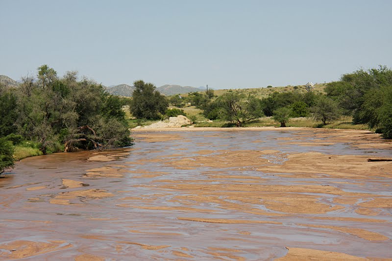 Zurück am Auto, schlichten wir unsere Einkäufe auf die Sitze und wollen nun noch, bevor die Sonne ganz verschwindet, einen Blick auf den Swakop River erhaschen, der zum ersten Mal seit langen Jahren wieder so viel Wasser führt, dass er den Durchbruch ins Meer geschafft hat. Ein Ereignis, dessen Seltenheitswert man in unseren Breiten nur schwer nachvollziehen kann – wir haben ja Wasser im (scheinbaren) Überfluss und bei uns schwappen Flüsse und Seen in der Regel eher mal über als dass sie austrocknen würden. Ganz anders in Namibia: hier gibt es sogenannte Trockenflüsse (Riviere), die jahrelang keinen sichtbaren Tropfen führen, allein am grünen Vegetationssaum am Rande des wadi-artigen Betts erkennt man die fast immer vorhandene, unterirdische Feuchtigkeit. Wenn es dann allerdings regnet, richtig regnet, füllen sich diese Sandläufe in Minutenschnelle mit Wasser und können beträchtlich anschwellen. Im sandigen Untergrund aber versickern die Fluten meist rasch wieder – und so ist der Durchbruch des etwa 460 Kilometer langen Swakop River, der auf seinem Weg vom Khomas-Hochland viel Sand zu überwinden hat, ein echtes „Jahrhundert-Ereignis“.