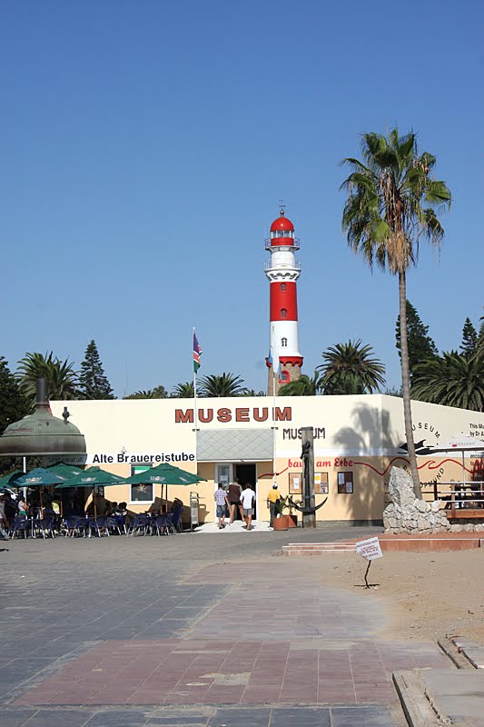 Entspannt bummeln wir zurück auf die Uferpromenade, schlendern im Schatten der mächtigen Palmen Richtung Leuchtturm, amüsieren uns über den als Palme getarnten Sendemast und die vielen deutschsprachigen Schilder. Blendet man die zahlreichen schwarzen Kinder mal aus, die sich fröhlich bibbernd im eiskalten Wasser des Benguela-Stroms tummeln, man könnte sich wirklich in einem deutschen Seebad wähnen. Oder aber in einer der Teutonen-Ferienhochburgen wie Mallorca oder Gran Canaria. Auch auf diesen, von deutschen Touristen innig geliebten Inseln sind ähnliche Bausünden zu finden, wie wir sie auf unserem weiteren Weg entlang der Waterfront zu Gesicht bekommen: häßliche Bungalow-Siedlungsklötze im Einheitslook, Urlaubsghettos, gepanzert mit wenig individuellen, verschiedenfarbigen Fliesen (der besseren Abwaschbarkeit und Wetterbeständigkeit wegen), Wohnsilos, die zum größten Teil so phantasievolle deutsche Namen wie „Die Welle“ oder „Dünenblick“ tragen. Ein Traum für jeden, der sich in solcher Umgebung wohl fühlt. Ich tu’s nicht und Heinz meint nur: „Naja, geschenkt würde ich es nehmen.“