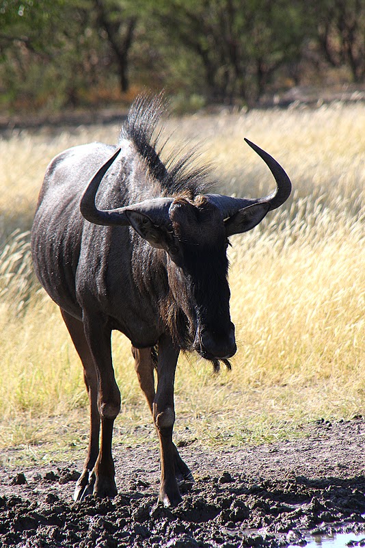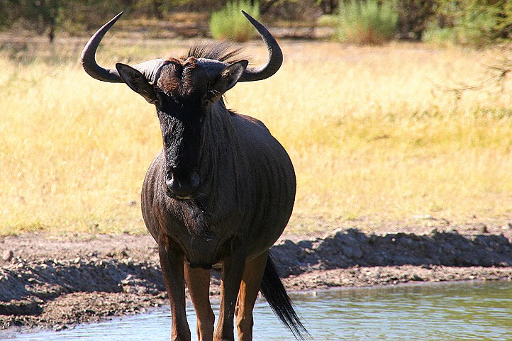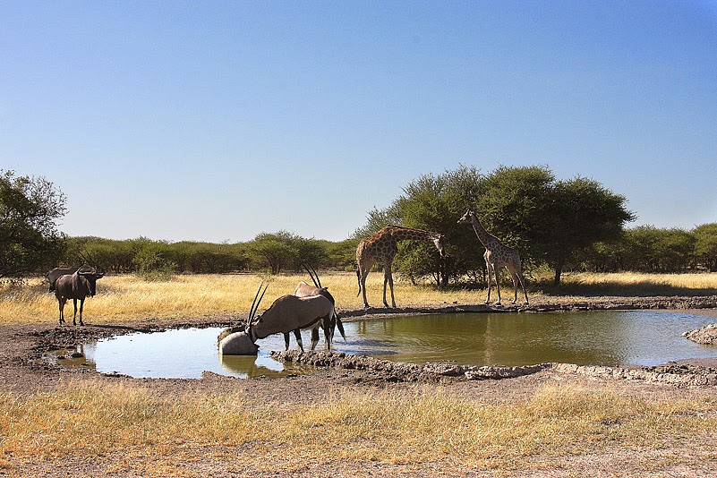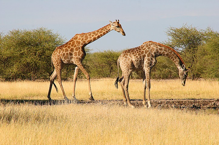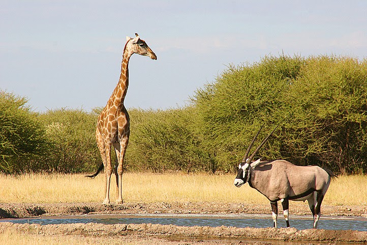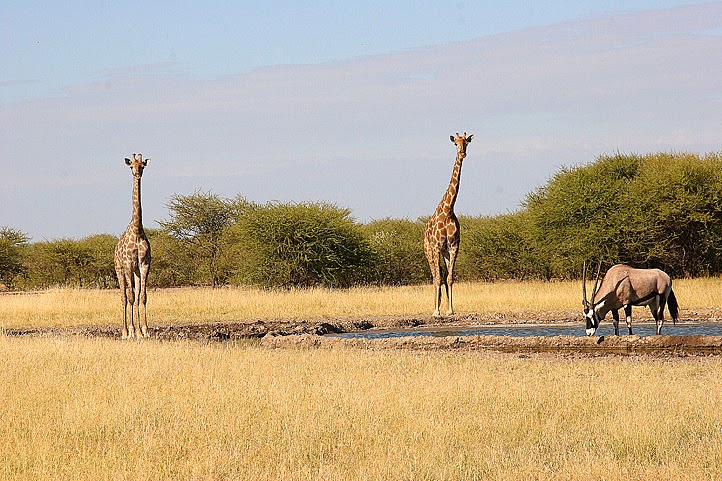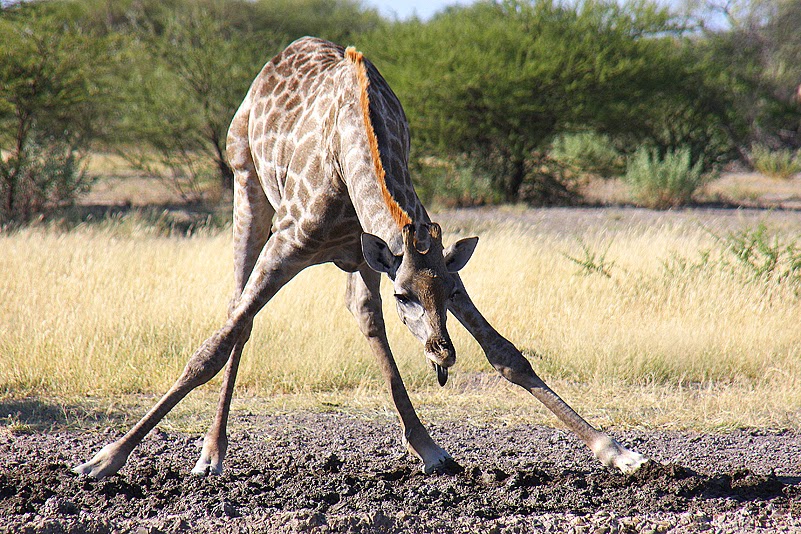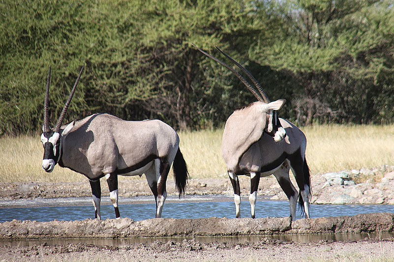 Die Tiere müssen manchmal offenbar eine bestimmte Größe haben, damit wir Menschen sie sehen. So wie die beiden Giraffen, die wir bald nach Verlassen unseres Camps am pan-eigenen Wasserloch antreffen. Die Langhälse schicken sich gerade zum Trinken an, unterbrechen aber ihr Vorhaben, da sie sich von unserer Ankunft gestört fühlen. Mißtrauisch werden wir beäugt, nach einer Weile jedoch für harmlos befunden und die umständlichen Verrenkungen beginnen von Neuem. Zentimeter für Zentimeter werden hierfür die beiden Vorderbeine immer weiter gespreizt, bis der Hals zum Wasser gebeugt werden kann – permanentes, aufmerksames Sichern ist dabei natürlich oberste Pflicht. Und obwohl wir schon oft trinkende Giraffen sehen konnten, ist solch ein Anblick doch immer wieder schön, zumal ich mir nie eine leise Erleichterung verkneifen kann, wenn ich Zeuge des Erfolgs dieser oft recht zeitraubenden Trinkvorbereitungen bin. Unseren beiden Langhälsen sind allerdings nur wenige, kleine Schlucke vergönnt, denn nebenan geraten sich zwei Oryxböcke in die Haare und schrecken mit ihren Kampfeshandlungen sowohl die zwei Giraffen hoch, als auch ein friedlich im Wasser stehendes Gnu. Sofort gerät Hektik in die vormals so friedliche Szene, die noch verstärkt wird, als zwei weitere Autos an der Tränke eintreffen. Die Giraffen galoppieren in dem für sie typischen, schaukelnden Laufschritt vom Wasserloch weg und verstecken sich hinter ein paar Bäumen, das Gnu flüchtet Hals über Kopf und die beiden Spießböcke sind davon so irritiert, dass sie ihrerseits nun ebenfalls Gas geben.