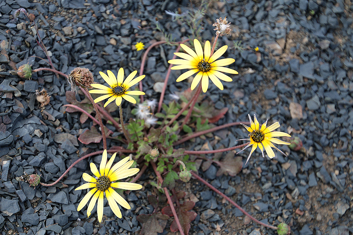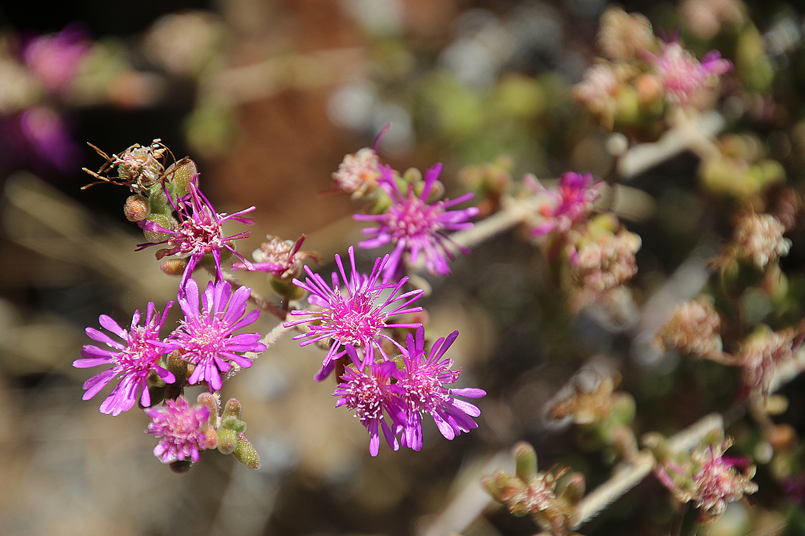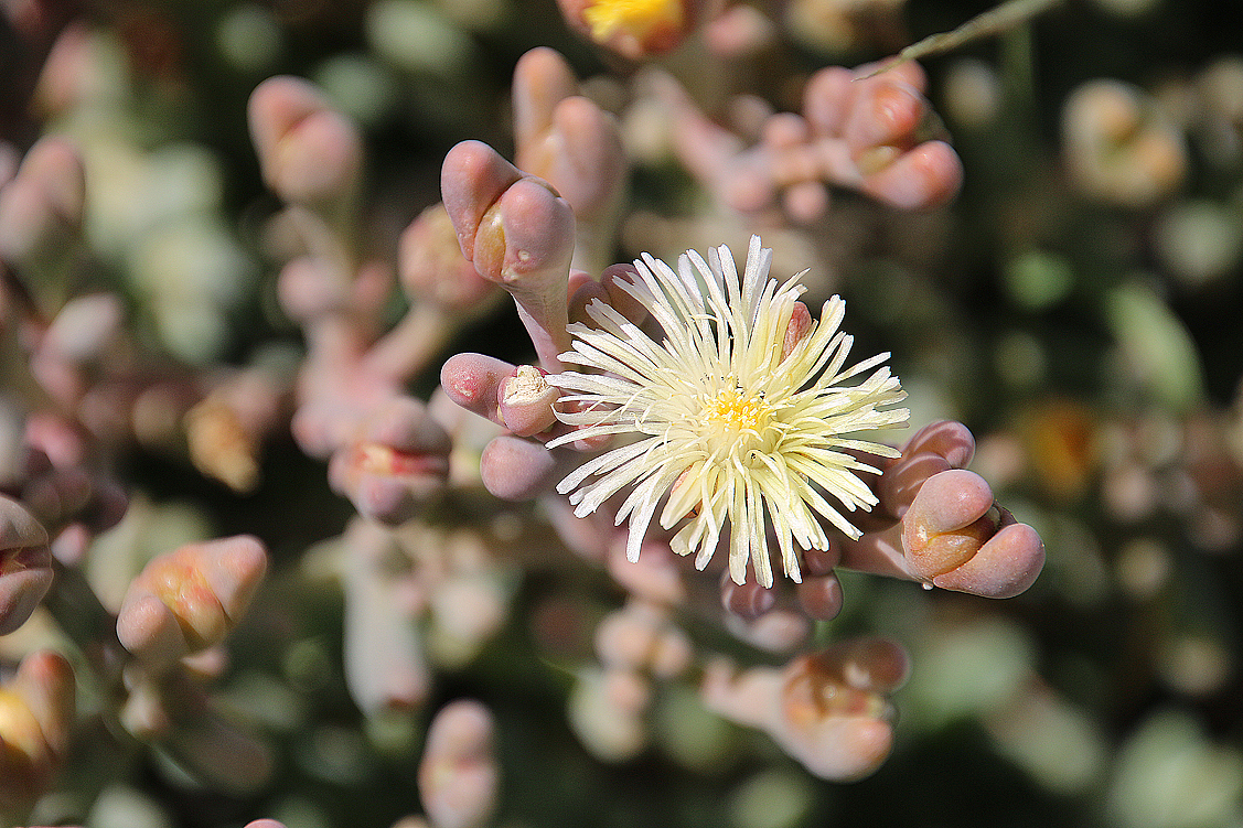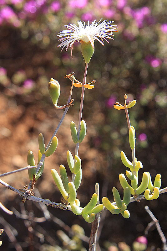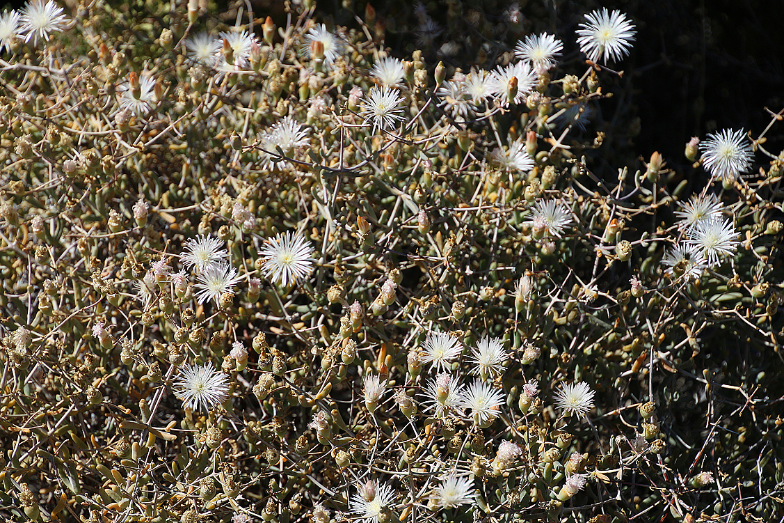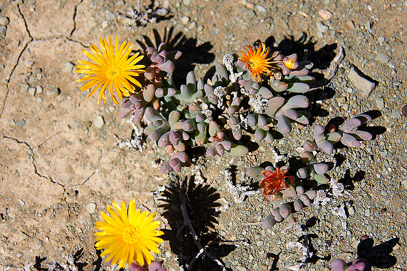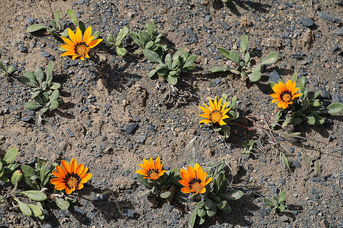 Manch ein Zwiebelliebhaber sucht sein Leben lang nach einem wild wachsenden Exemplar und wird nicht fündig – neben uns, direkt zu unseren Füßen jedoch, gedeihen mehrere stattliche Exemplare dieses aufregenden Hyazinthengewächses. Natürlich erregt das wieder mal niemanden außer uns… Aber schee sans, so schee scho, de Pflanzl – wie der Bayer sagt; ein schwungvoll gebogenes Blatt in undefinierbarem Grün, auf dem sich ziegel- bis burgunderrote Muster in einer eigenen Kreationsmischung aus Zebra- und Tigerstreifen darbieten. Auch die Blütenstände, die mit ihren blass grüngelben oder rosa überhauchten Glöckchen beinahe gegen die spektakulären Blätter abkacken, gefallen Heinz und mir ausnehmend gut. Doch die Lachenalias sind nicht die einzigen Pflanzen, die hier gedeihen. Überall wuchern Mittagsblumen mit Blüten in allen Farbabstufungen zwischen weiß und violett, dazwischen recken Gazanien ihre gelbbraunen Köpfchen plakativ gen Himmel und so manch andere Asterngewächse sind ebenfalls zu finden. Entzückt sausen wir herum, honigsammelnden Bienen gleich, von einer Pflanze zur anderen. Nebenbei pflücke ich noch hier und da eine Samenkapsel von den diversen Mesembs ab, in der Hoffnung, sie heute Abend genauer unter die Lupe nehmen zu können.