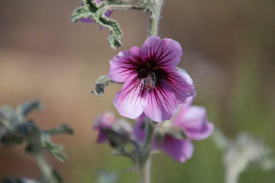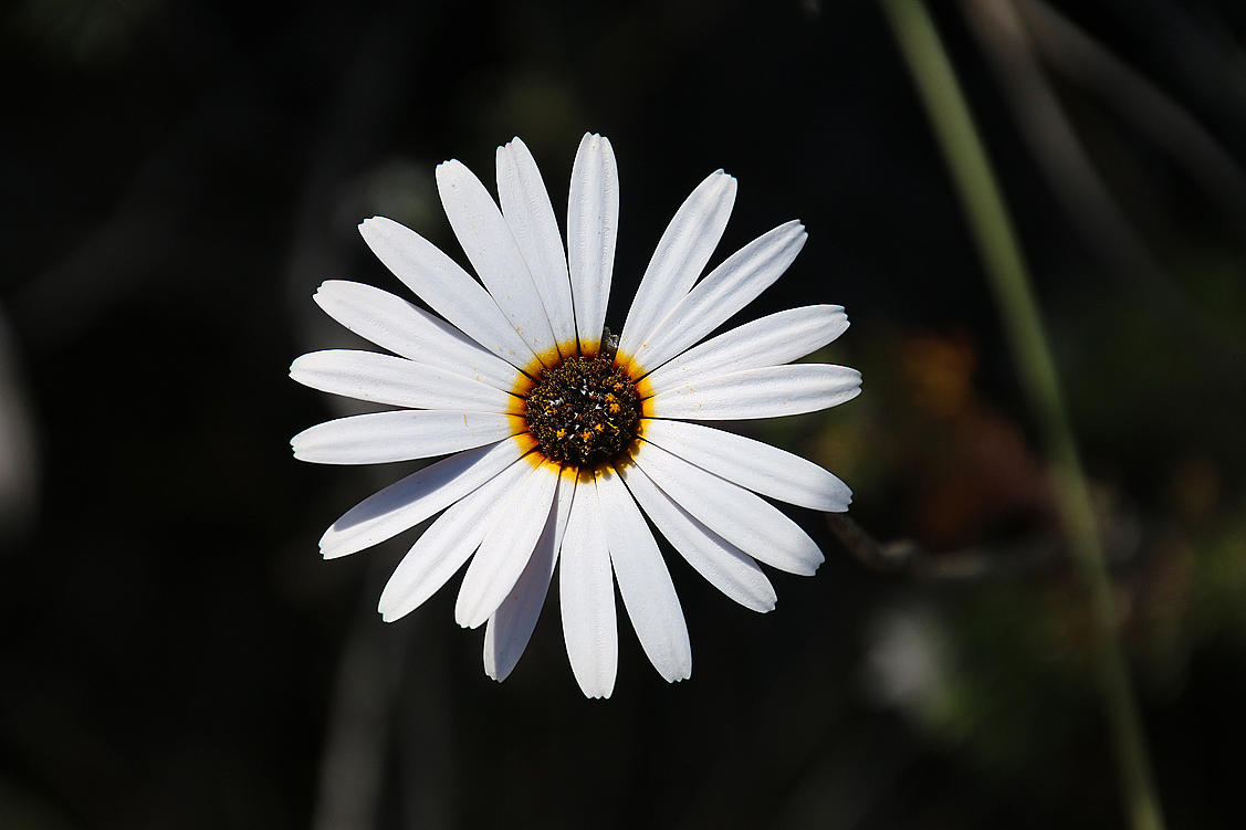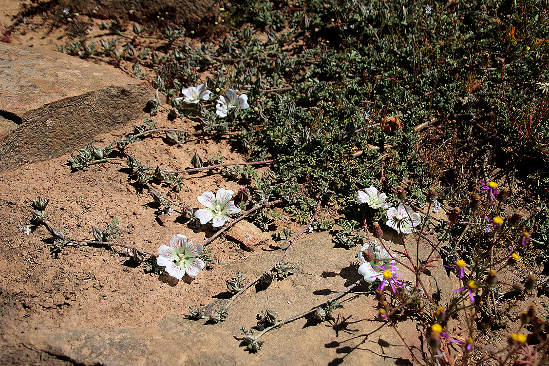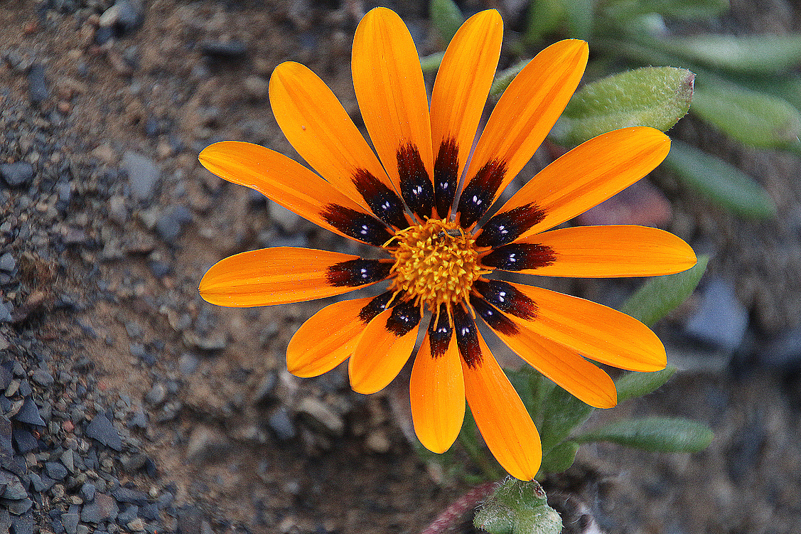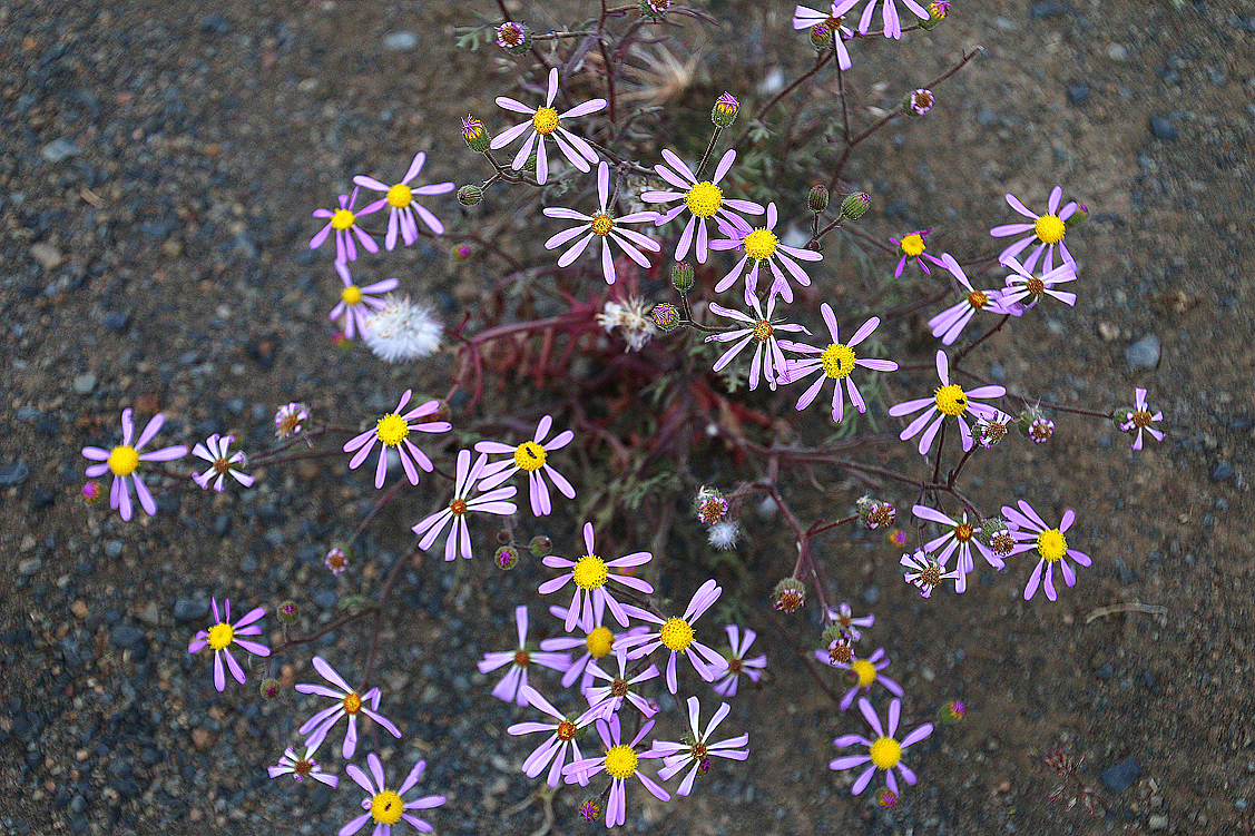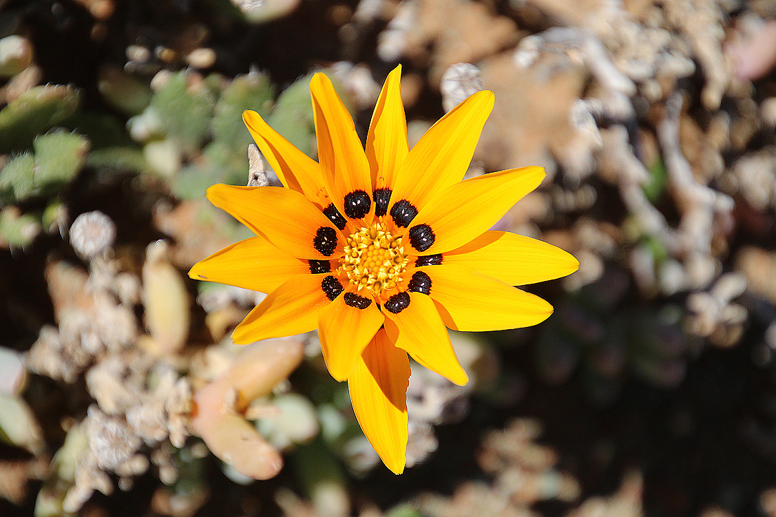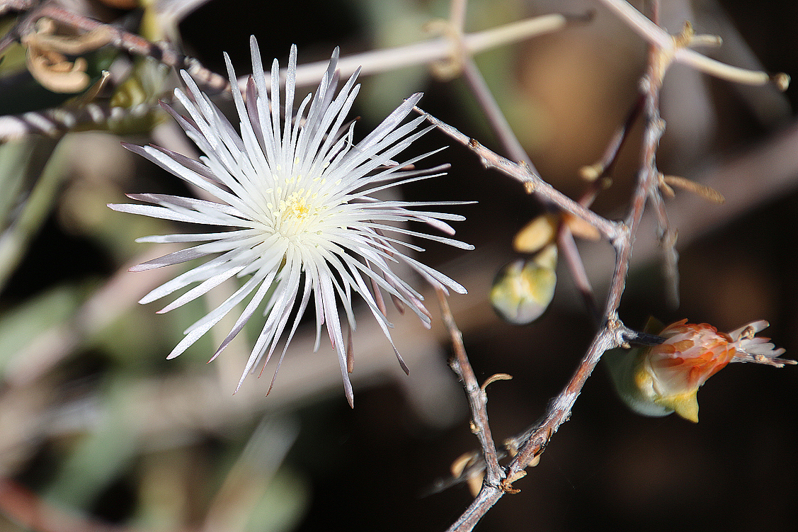 Manch ein Zwiebelliebhaber sucht sein Leben lang nach einem wild wachsenden Exemplar und wird nicht fündig – neben uns, direkt zu unseren Füßen jedoch, gedeihen mehrere stattliche Exemplare dieses aufregenden Hyazinthengewächses. Natürlich erregt das wieder mal niemanden außer uns… Aber schee sans, so schee scho, de Pflanzl – wie der Bayer sagt; ein schwungvoll gebogenes Blatt in undefinierbarem Grün, auf dem sich ziegel- bis burgunderrote Muster in einer eigenen Kreationsmischung aus Zebra- und Tigerstreifen darbieten. Auch die Blütenstände, die mit ihren blass grüngelben oder rosa überhauchten Glöckchen beinahe gegen die spektakulären Blätter abkacken, gefallen Heinz und mir ausnehmend gut. Doch die Lachenalias sind nicht die einzigen Pflanzen, die hier gedeihen. Überall wuchern Mittagsblumen mit Blüten in allen Farbabstufungen zwischen weiß und violett, dazwischen recken Gazanien ihre gelbbraunen Köpfchen plakativ gen Himmel und so manch andere Asterngewächse sind ebenfalls zu finden. Entzückt sausen wir herum, honigsammelnden Bienen gleich, von einer Pflanze zur anderen. Nebenbei pflücke ich noch hier und da eine Samenkapsel von den diversen Mesembs ab, in der Hoffnung, sie heute Abend genauer unter die Lupe nehmen zu können.
