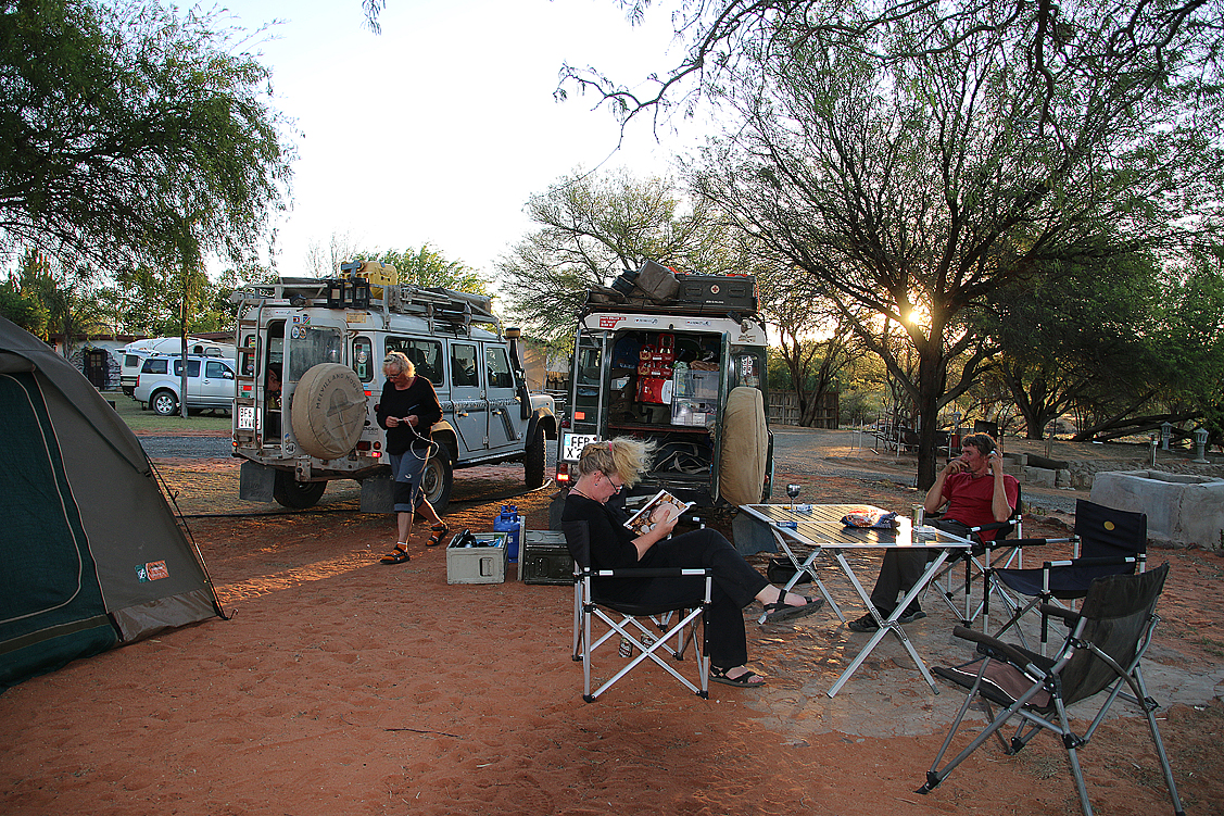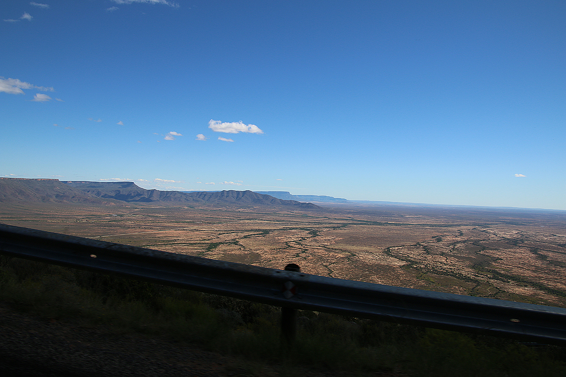 Es geht hinunter über den Van Rhyns Pass, von dem wir heuer eine ungetrübte und großartige Aussicht auf die weiten, darunterliegenden Ebenen haben und dann ist es nicht mehr weit. Am späten Nachmittag treffen wir im Caravan Park ein, werden, wie auch letztes Jahr schon, von freundlichen Hunden empfangen und checken ein. Aber, holla die Waldfee, wir dürfen diesmal auf das offizielle Campinggelände, müssen uns nicht auf dubioses Nebenterrain quetschen und auch nicht mit der retardierten Schnapsdrossel von 2013 rumschlagen. Zufrieden kurven wir auf den uns gezeigten Platz, grüßen dabei diverse neugierig schauende, ebenfalls campende Einheimische und lassen uns mitsamt unserem Krempel am östlichen Ende des Areals nieder. Mhm, ein wenig merkwürdig mutet dieser Caravanpark trotz fehlender Schnapsdrossel und offiziellem Stellplatz auch diesmal an – fast, als würde man als Fremder auf einer Dauercampe am Rheinufer einlaufen… Doch von Flussufer ist hier weit und breit nichts zu sehen – was also tun die alle hier?! Egal, Hauptsache wir haben ein Plätzchen für die Nacht und können uns wohl und sicher fühlen! Vertrauensvoll akkomodieren wir uns und nutzen dann den Rest des Tages zum Rumlungern, Waschen, Duschen, Kochen, Trinken, Lesen, Schauen und was man halt sonst noch tun möchte. Während Heinz zum Beispiel einigen nestbauenden Webervögeln auf der Spur ist, packe ich meine prä-calvinianischen Mittagsblumenkapseln aus und schreite zu deren Bestimmung.