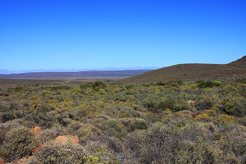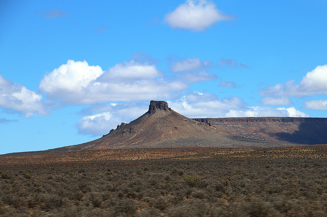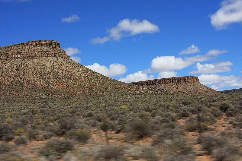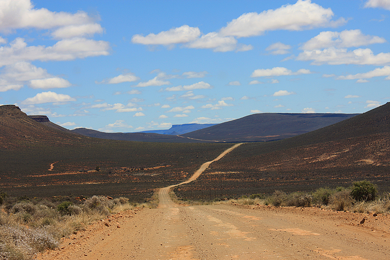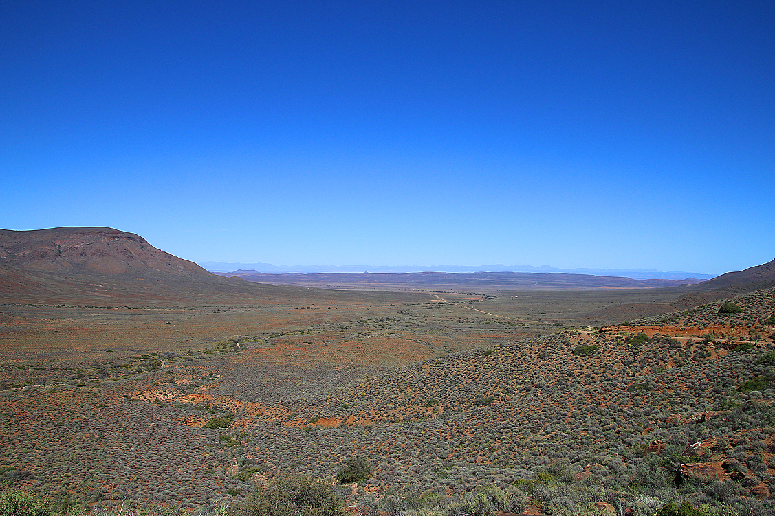 Nach einer sehr interessanten halben Stunde schließlich setzen wir unseren Weg fort, biegen auf die R355 Richtung Calvinia ab – und kommen nicht mal fünf Kilometer weit, als wir schon wieder halten müssen. Eine riesige, armdicke Puffotter liegt mitten auf der Straße! Jochen fährt einen eleganten, reifenquietschenden Bogen um das Reptil, sucht nach einer passenden Gelegenheit zum Wenden, während ich per Walkietalkie die weit hinter uns fahrenden Annette und Ute anfunke. „Was? Ne Puffotter? Wo? Wir sehen nix!“ Wir drehen, fahren zurück, begegnen den beiden ratlosen Frauen – und sehen auch nichts mehr. Schade! Aber gut für die Giftschlange: wir hatten gedacht, sie sei angefahren worden und tot oder zumindest schwer verletzt. Doch offenbar wollte sie, quicklebendig, lediglich die Teerstraße überqueren und hat sich mittlerweile völlig unversehrt aus dem Staub gemacht. Wir freuen uns für das Riesenreptil, obwohl wir es natürlich gerne von Nahem gesehen hätten.