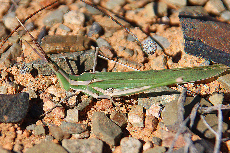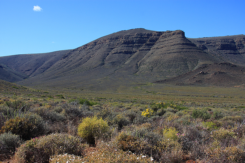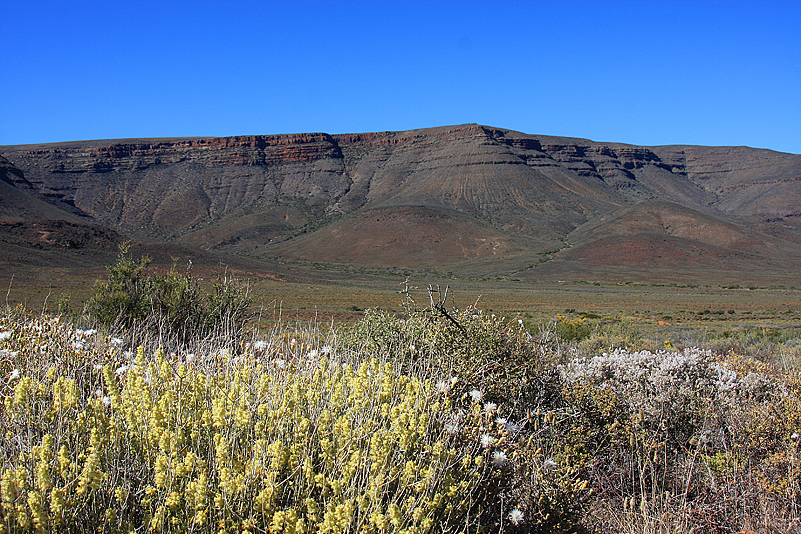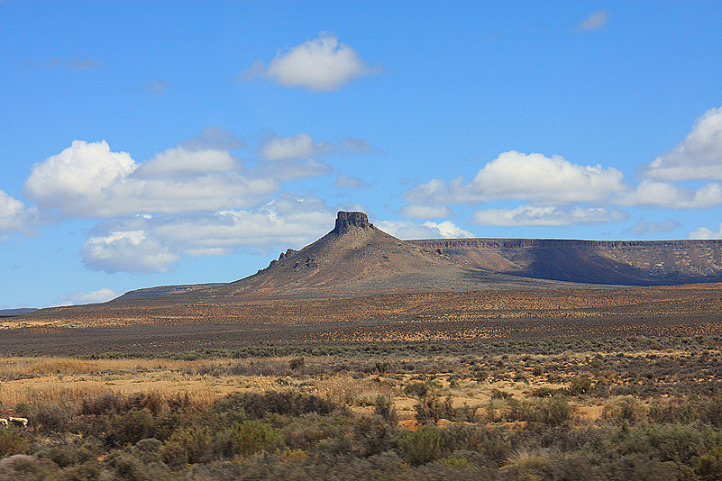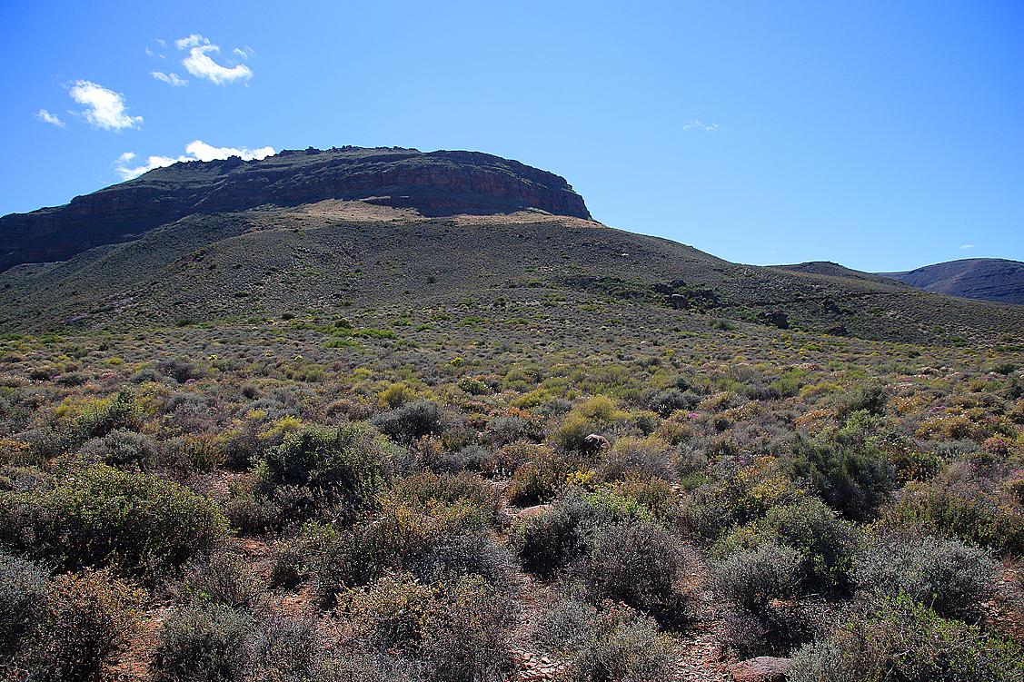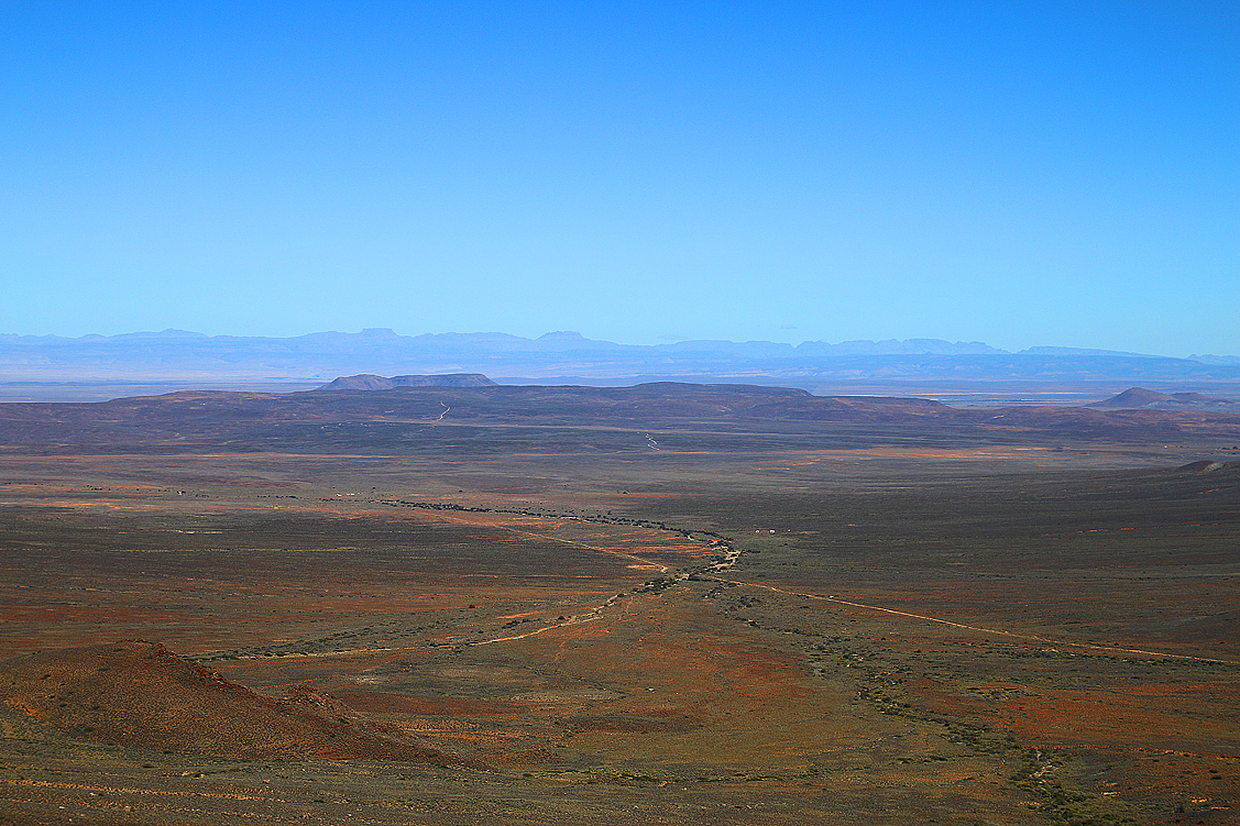 Nach einer sehr interessanten halben Stunde schließlich setzen wir unseren Weg fort, biegen auf die R355 Richtung Calvinia ab – und kommen nicht mal fünf Kilometer weit, als wir schon wieder halten müssen. Eine riesige, armdicke Puffotter liegt mitten auf der Straße! Jochen fährt einen eleganten, reifenquietschenden Bogen um das Reptil, sucht nach einer passenden Gelegenheit zum Wenden, während ich per Walkietalkie die weit hinter uns fahrenden Annette und Ute anfunke. „Was? Ne Puffotter? Wo? Wir sehen nix!“ Wir drehen, fahren zurück, begegnen den beiden ratlosen Frauen – und sehen auch nichts mehr. Schade! Aber gut für die Giftschlange: wir hatten gedacht, sie sei angefahren worden und tot oder zumindest schwer verletzt. Doch offenbar wollte sie, quicklebendig, lediglich die Teerstraße überqueren und hat sich mittlerweile völlig unversehrt aus dem Staub gemacht. Wir freuen uns für das Riesenreptil, obwohl wir es natürlich gerne von Nahem gesehen hätten.