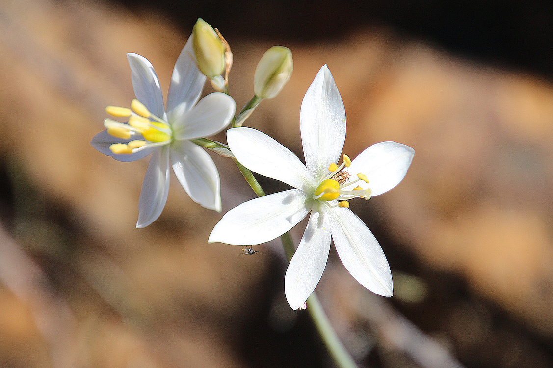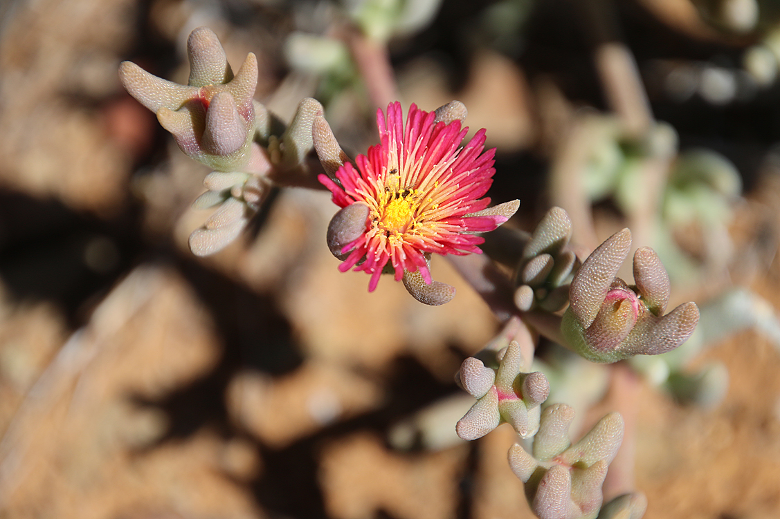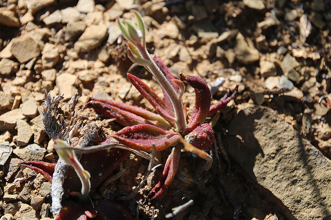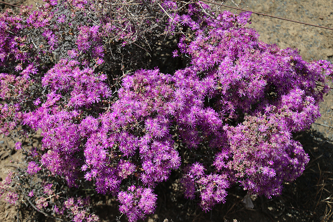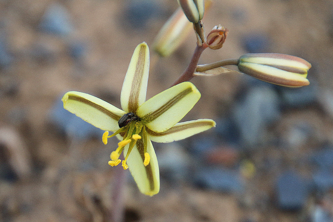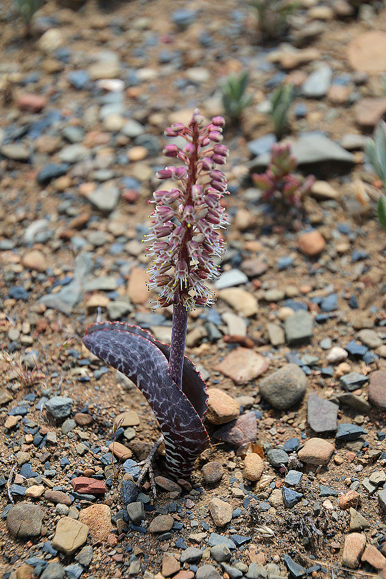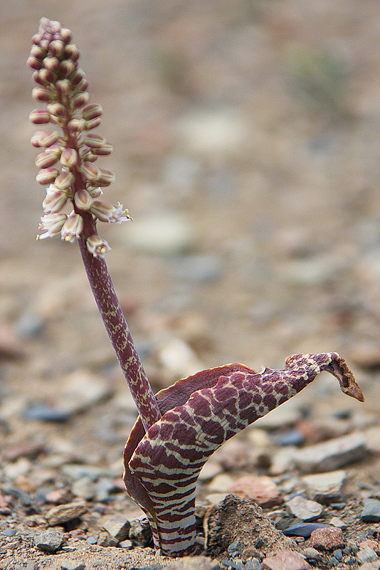 Doch das geht natürlich nicht, denn es liegt erstens noch einiges an Tagesstrecke vor uns und, zweitens, dürfen wir die Geduld unserer Mitreisenden nicht überstrapazieren, so schwer es auch fällt. Den einen oder anderen Blumenstopp aber schinden wir schon noch raus. Zum Beispiel da, wo die R354 auf die R355 trifft. Dort, am Fuße der Hantamberge, die für ihren Reichtum an Zwiebelgewächsen bekannt sind, werden wir auch direkt neben der Straße fündig! Verführt durch üppig und in allen Rosa-Violett-Tönen blühende Mittagsblumenpolster, leiern wir unseren Mitreisenden, die sich dem Geblühe ebenfalls nicht abgeneigt zeigen, einen weiteren Halt aus den Rippen, schwärmen aus und entdecken dabei pflanzliche Kleinodien im Bankett, die man hier, im Kiesstreifen einer Verkehrsstraße, eher nicht vermuten würde: zum Beispiel eine Lachenalia zebrina forma zebrina!