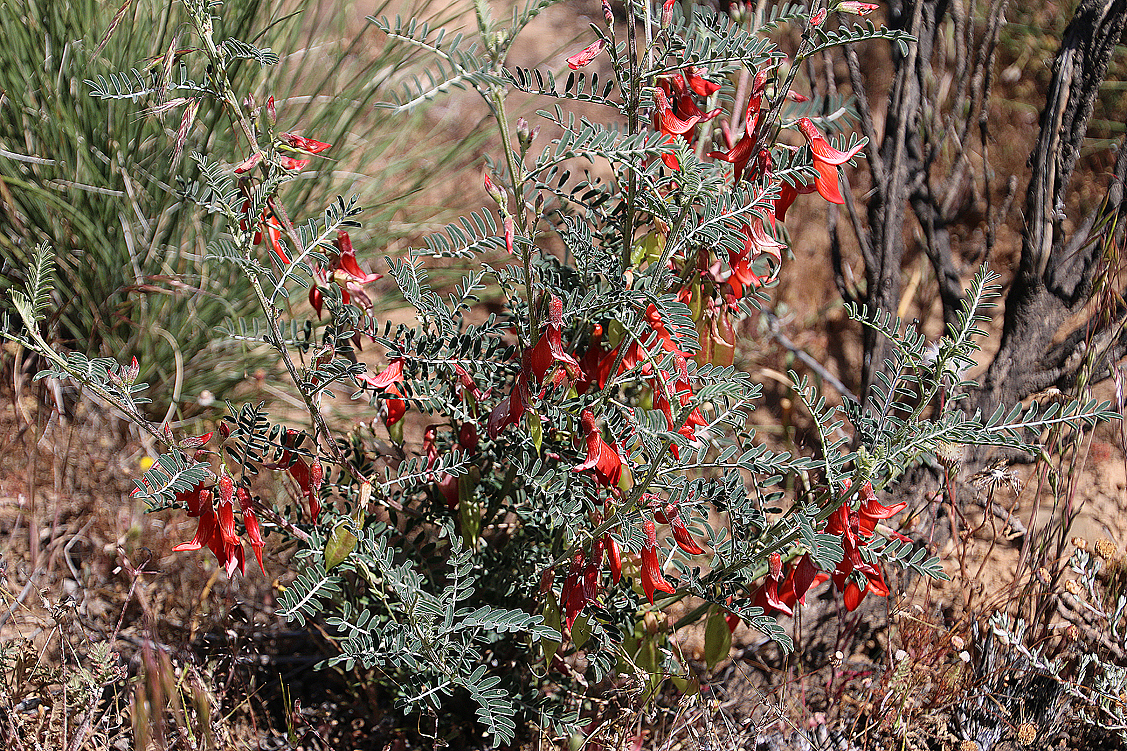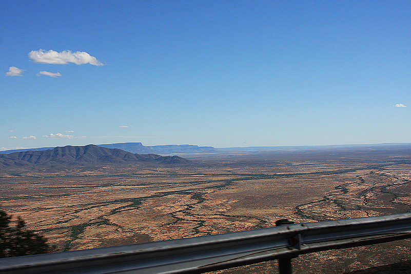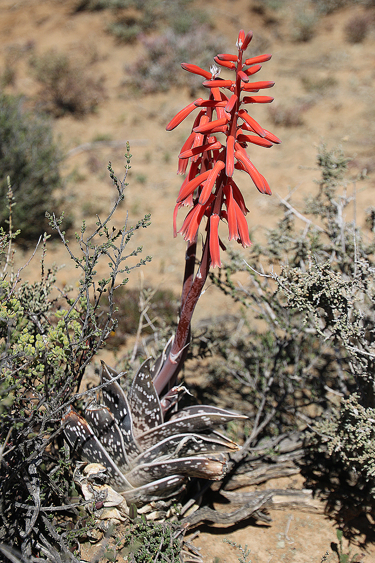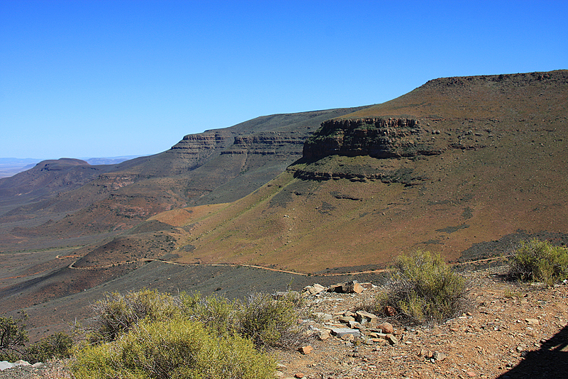Uns wundernd, klettern wir in unsere Autos und fangen dann Ute weit, weit oben wieder ein. Bald jedoch müssen wir erneut anhalten, um die Aussicht vom Gannaga-Pass zu genießen, kurz darauf abermals, weil plötzlich ein ganzes Feld roter Gladiolen vor uns liegt und drei Kilometer später schon wieder, da Heinz eine besondere Aloe erspäht hat. Dabei passieren wir, ganz nebenbei, das schreckliche Lodge-Gebäude, das mich auf der letzten Tour so unangenehm berührt hatte. Heuer finde ich es zwar immer noch nicht sonderlich einladend, doch lange nicht mehr so abstoßend – was sicher der reichlich blühenden Pflanzenwelt zuzuschreiben ist. Und die ist heuer so üppig, dass ich auf der weiteren Strecke nicht mal die altbekannten Probleme mit dem nicht endenwollenden Hochplateau bekomme! Alle naslang taucht ein neues Pölsterchen, ein neues Pflänzchen vor uns auf, und Heinz und ich würden am liebsten zu Fuß weitergehen, um nur ja nichts zu verpassen.
