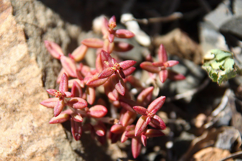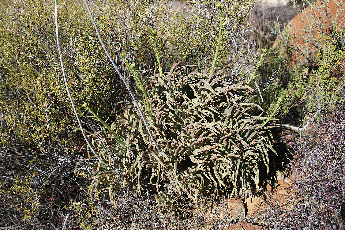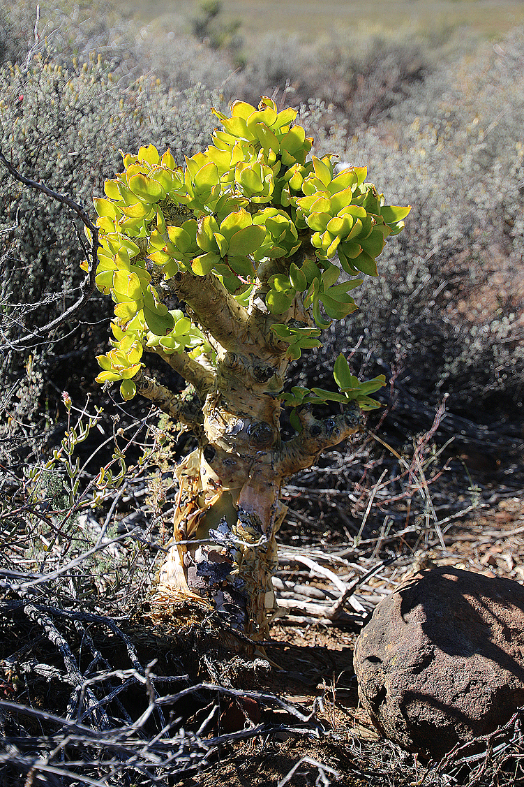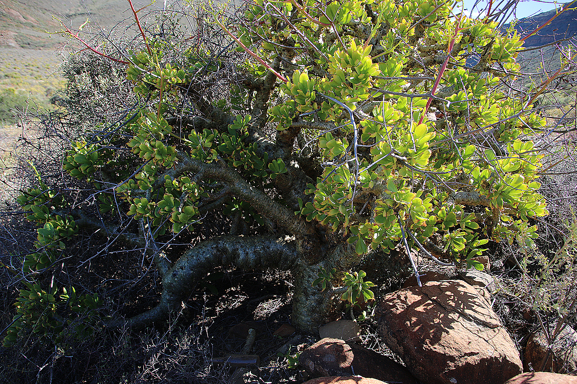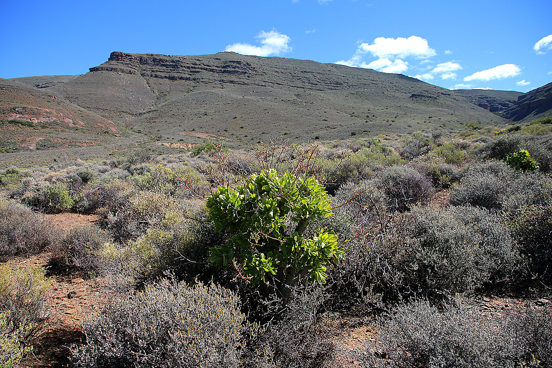 In diesem spannenden Bewusstsein beenden wir unser Frühstück, packen, verschließen sorgfältig alle Türen und liefern zu guter Letzt unseren Schlüssel im Büro ab, bevor wir zu neuen, alten Zielen aufbrechen. Als erstes ist der Tylecodon-Wald an der Reihe, der am Fuße des Gannaga-Passes liegt. Wir informieren Ute, dass es etwas länger dauern könnte und schwärmen aus. Ute schraubt sich sofort bergauf, während wir, wie sollte es auch anders sein, bereits nach wenigen Schritten in die Hocke gehen. Die Vegetation ist zwar weit vom einem „Blütenmeer“ entfernt, zeigt sich aber trotzdem um vieles üppiger als letztes Jahr. Es grünt und blüht, die Tylecodons leuchten in der Sonne und wir entdecken permanent etwas Neues, aber auch Bekanntes, was wir in einem derart grünen Zustand noch nie gesehen haben. Nicht alles sind hierbei Sukkulenten, doch das tut unserer Freude keinen Abbruch. In dieser Freude verlieren sich Heinz, Annette und Jochen allmählich und schwelgend im Gelände, ich hingegen spurte kurz noch mal zum Auto, weil ich vergessen hatte, meine Knieschoner anzulegen. Gerade klette ich die Polster fest und will wieder losstürmen, als ein Auto neben mir hält. Der Fahrer, ein älterer, recht kerniger Herr, erkundigt sich besorgt, ob alles in Ordnung sei. Ja, Dank der Nachfrage! Wirklich? Mit scheelem Blick beäugt er meine Knieschoner. Erst, als ich ihm hoch und heilig schwöre, dass alles Okay sei und erkläre, warum ich diese seltamen Kniedinger trage, ist er beruhigt. „Ah, Sie haben Interesse an Pflanzen! Ich bin Farmer und kann Ihnen da einiges zeigen!“ Spricht’s und springt aus dem Wagen. „Folgen Sie mir!“ Er steuert ins Gelände und hebt mit seinen Erklärungen an, die mich fast zum Kichern bringen, weil sie so anders sind, als ich erwartet hätte. Er kennt zwar wirklich viele Gewächse, kann aber kein einziges bei seinem wirklichen Namen nennen, sondern hat nur Schimpfworte parat. Formulierungen wie Unkraut und Gestrüpp sind hierbei noch die freundlichsten, Pferdemörder und Schwiegermuttergift die weniger charmanten. In seinen Farmersaugen ist einfach alles, was hier wächst, unnütz und eine Plage.