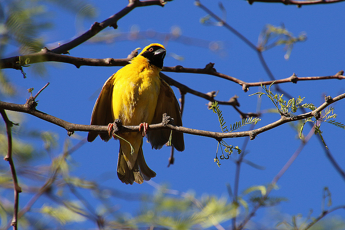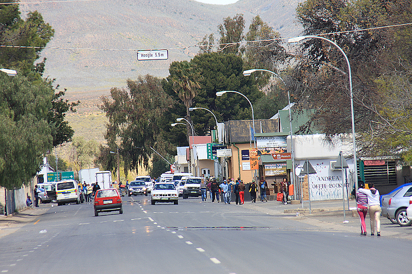 Doch Entschädigung für die entgangene Sichtung naht: kaum sind wir wieder losgefahren, legt Jochen die nächste Vollbremsung hin, denn er hat einen kleinen Schwarm auffällig gefärbter Vögel entdeckt. Männliche Oryxweber in vollem Balz-Ornat! Normalerweise gleichen diese Vögel normalen Haussperlingen, aber zur Balzzeit wechseln die Männchen ihr Erscheinungsbild, und aus den eher unscheinbaren Tieren werden leuchtend orangerote Federbälle mit tiefschwarzer Brust und Gesichtsmaske. Jochen und Heinz sind ganz aufgeregt – die Oryxweber allerdings auch. Unruhig flattern sie von Zaunpfahl zu Zaunpfahl, immer weiter weg von uns, der Reichweite unserer Zooms und der Ferngläser. Dennoch können wir sie eine ganze Weile recht gut beobachten und freuen uns über diese schöne Sichtung. Annette jedoch entwickelt allmählich eine ähnliche Unruhe wie die Weber – besser gesagt, sie wird ungeduldig. „Was ist denn jetzt schon wieder?“, quäkt es entnervt aus dem Walkietalkie. „Oryxweber!“ „Meine Güte! Ich fahre jetzt mal vor und wir treffen uns in Calvinia. Herrschaften, wir müssen noch einkaufen!“ Ja, ist ja gut! Aber die bunten Weber sind nun ohnehin entschwunden, also klettern wir wieder ins Auto, holen Annette und Ute rasch ein, überholen sie und trudeln bald darauf in Calvinia ein. Zielstrebig kurven wir zum (einzigen) Supermarkt, den wir ja schon von unserer letzten Tour her kennen und nehmen die übliche Aufgabenverteilung vor. Annette und Jochen gehen einkaufen und wir bewachen die Autos. Bah, dieses Gebettel vor dem Laden ist echt nervig! Noch nerviger aber ist, dass wir die beiden Wagen auf allen Seiten im Auge behalten müssen, denn es passiert immer wieder, dass abgewiesene Bettler ihren Frust mit einem Messer an den Reifen der reichen weißen Geizkrägen auslassen. Nein, das ist nicht überall so, aber gerade in kleineren Städten, die weit und breit die einzige Einkaufsmöglichkeit bieten, leider nicht unüblich. Also patroullieren wir um unsere Land Rover herum und lassen sie nicht aus den Augen. Gottseidank geben Annette und Jochen beim Einkaufen Gas und wir müssen nur eine dreiviertel Stunde einen auf Wachhund machen – eine Aufgabe, die ich wahrlich nicht sonderlich mag. Aber immer noch besser, als selbst einkaufen zu müssen…