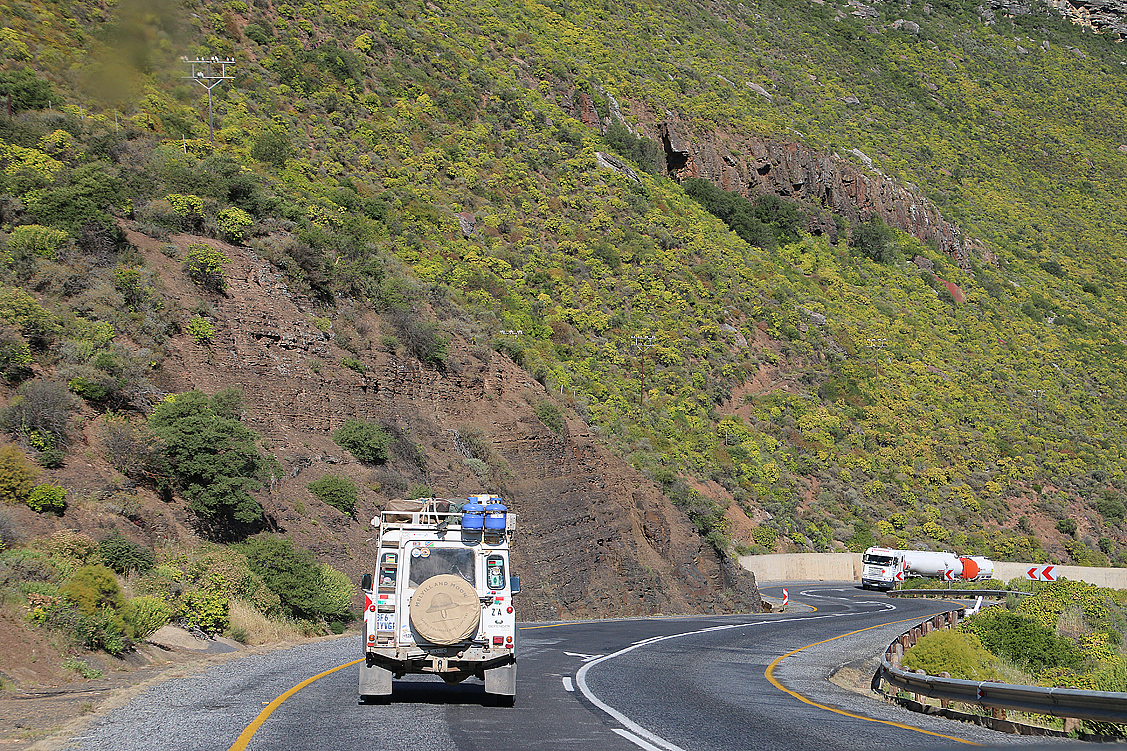 Das hätten wir also. Jetzt aber stehen weitere Pflichten an, zu deren Erledigung wir uns kurz aufteilen: Annette und Ute fahren Getränke kaufen, während Jochen, Heinz und ich die nächste Tankstelle ansteuern, um unseren Wassertank im Landy aufzufüllen. Letztes Jahr nämlich hatte sich Jochen verweigert, rechtzeitig Wasser aufzunehmen, sodass wir schließlich genötigt waren, am Gate des Namaqua NPs mit natronhaltiger Brühe nachzufüllen. Bäh, damit war der Morgenkaffee alles andere als ein Genuss! Einer Wiederholung dieses Zustandes beugen wir nun vor – darauf hatte ich bestanden, und war erstaunlicherweise nicht auf Gegenwehr gestoßen… Anschließend warten wir auf Annette und Ute, deren Auto auch noch befüllt wird, während ich die Scheiben unserer Gefährte auf Hochglanz bringe. So, alles erledigt, wir können endlich weiter! Weiter Richtung Vanrhynsdorp, wo wir unser heutiges Nachtquartier aufschlagen werden.