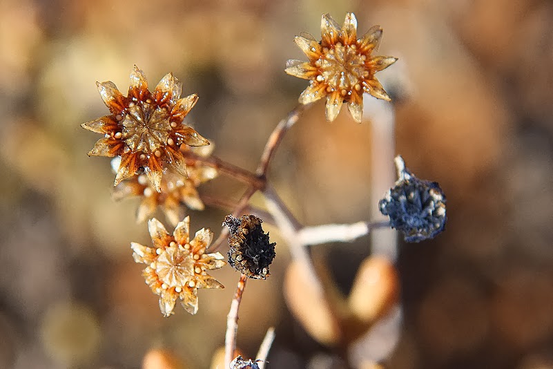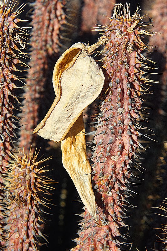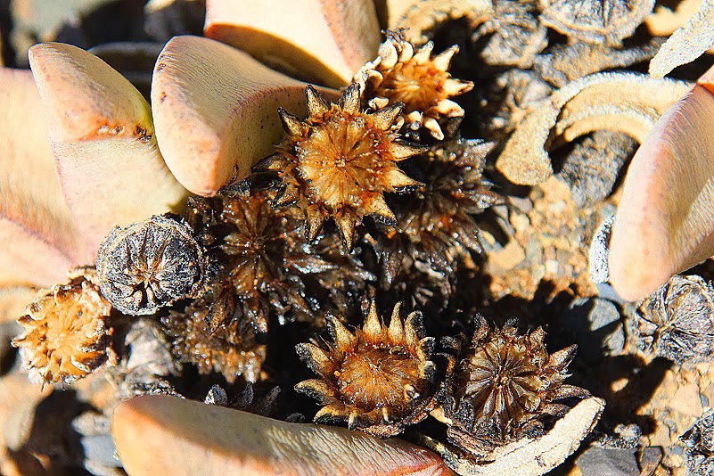 Dieses Sichtreibenlassen und das Anhaltenkönnen, wann immer uns danach gelüstet, ist ein weiterer Vorteil eines Tages ohne Campwechsel, wäre aber auch nur halb so entspannend, würden wir nicht alle Vier am selben Interessenstrang ziehen. Und das tun wir, denn kaum ruft einer „Stopp“, wie jetzt gerade, halten wir an und gehen auf Erkundungstour. Jochen und Annette klettern das sandig-steinige Flussbett hinauf, während Heinz und ich eher felsigeren Gefilden zustreben, denn sie sind die idealen Standorte für unsere kleinen Lieblinge. Schon auf den ersten Metern werden wir fündig: eine riesige Hoodia reckt ihre stacheligen Triebe gen Himmel und präsentiert uns einige sehr hübsche, sichelförmige Samenstände, die sich allesamt schon in die Umgebung entleert haben. Während mein Schneck sich nun auf die Suche nach jungen Hoodias macht – die man erstaunlicherweise sehr selten findet, klettere ich weiter und stoße auf viele, recht verschiedenartige Sukkulentenpölsterchen, an deren Samenkapseln ich nun endlich meinen extra mitgebrachten Pumpzerstäuber ausprobieren kann. Die Klappmechanismen der Wunderknöpfchen funktionieren, wie auch gestern schon, allesamt tadellos und prompt. Meine größte Freude aber habe ich an dem extrem differenten Innenleben der Kapseln: sie unterscheiden sich nämlich nicht nur in der äußerlichen Größe und der Kammernanzahl, sondern auch in ihrer inneren Konstruktion. Da gibt es, nun auch für mich deutlich sichtbar, eklatante Unterschiede in der Gesamtkonstruktion der für die Kapselöffnung relevanten Teile.