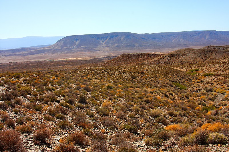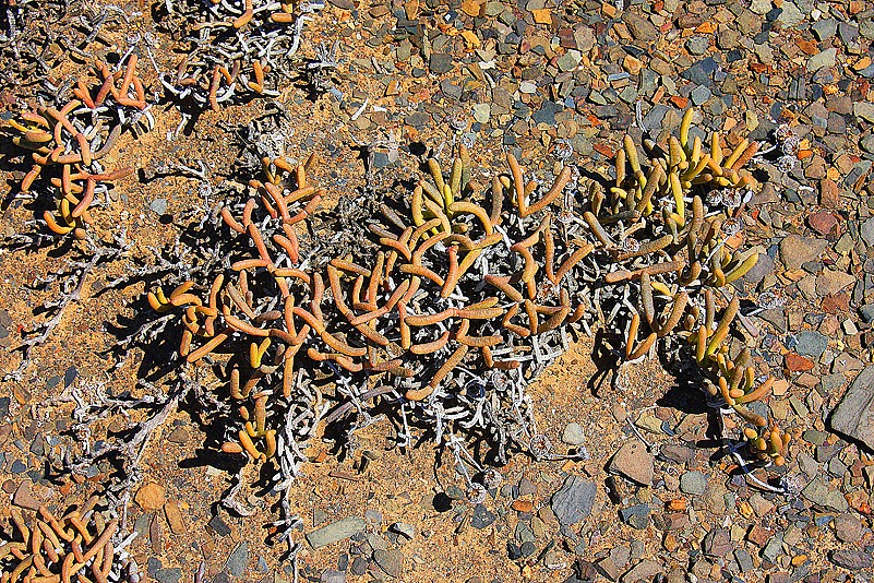 Toll war es dort oben, auf dem Leeuberg! Dennoch sind wir alle froh, wieder heil unten angekommen zu sein und ebenen Boden unter den Reifen zu haben. Dort schließlich, am Fuße des Bergs, macht die Pad dann einen weiten Schlenker nach Südosten und wir können unsere Bergroute nochmal von unten betrachten: mhm, da oben waren wir. Sooo steil sieht das gar nicht aus… Während wir noch ungläubig unsere Auf- und Ab-Strecke vom Flachen aus begutachten, öffnet sich zu unserer Rechten eine Ebene, wie sie interessanter nicht sein könnte. Sie ist extrem trocken, heiß, steinig und wird von sehr dunklen, teilweise schieferartig aufgefächerten, scharfkantigen Steinen dominiert. Zwischen dem aufgeheizten Geröll – das sehen wir schon aus dem fahrenden Auto heraus – sprießen allerlei Sukkulenten. Stopp!!! Jochen bremst brav, Heinz und ich stürmen aus dem Wagen – und befinden uns erneut im Paradies! Noch keine drei Meter sind wir vorsichtig über die Geröllebene getapst, als Heinz auch schon entzückt aufquiekt: „Eine Tanquana, eine Tanquana, Schneck, ich hab eine Tanquana gefunden!“ Eine Tanquana! Diese Erregung kann wahrscheinlich nur jemand verstehen, der sich näher mit Sukkulenten beschäftigt – eine Tanquana, das ist, vom Stellenwert her, so was ähnliches wie ein freilebender Balistar für einen Ornithologen. Naja, nicht ganz so selten, aber trotzdem hoch endemisch; Tanquanas wachsen nur auf Dwyka- und Ecca-Schieferfeldern in einem kleinen Gebiet zwischen der Großen, der Kleinen und der Tankwa Karoo. Welch ein toller Fund also!