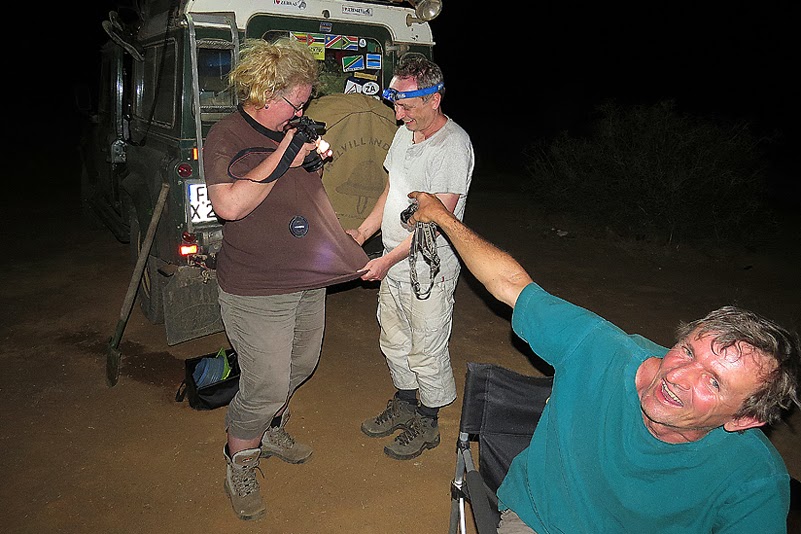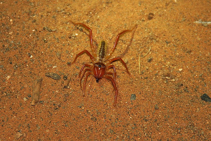 Und diesmal kriegen wir es auch zu Gesicht. Es. Es ist eine stattliche Solifuge, voll ausgewachsen, mit riesigen Chelizeren, superflink unterwegs und kein Tier, das ich gerne auf meinem T-Shirt sitzen hätte. Frrrrtzzzz, rrrrhhzzzzz, brrrrrtzzzz, so rennt das Spinnentier in einem Affenzahn auf dem sandigen Boden zu unseren Füßen herum. Unsere Köpfe zucken im Stakkato hin und her und wir wissen gar nicht, was wir jetzt zuerst tun sollen: fertig essen, aufstehen und der Muster-Solifuge fotografisch hinterherjagen oder einfach nur die Füße hochlegen und zusehen. Der Zeitraffer-Zickzackkurs der Walzenspinne allerdings ist so fesselnd, dass wir wie gebannt in unseren Stühlen kleben bleiben, die Füße auf dem Tisch, die Teller auf dem Schoß. Buschkino, Blockbuster! Als jedoch nach kurzer Zeit ein weiterer Protagonist, ein Skorpion, auf der Bildfläche erscheint, hält uns schließlich nichts mehr in unseren Kinositzen. Arachnophobia, Teil 27 1/2; Daddy Fattail versus Speedy Eightleg – und das live! Das muss man einfach fotografieren! Nun ja, die zwei Protagonisten folgen zwar ihrem eigenen Drehbuch, werfen sich nicht mordlüstern aufeinander, und tun auch sonst nichts wirklich Spektakuläres, aber spannend ist es trotzdem. Besonders wir, Zuschauer und Kameramänner zugleich, sind gefordert. Es ist eine durchaus anspruchsvolle Aufgabe, die beiden Spinnentiere im Fokus zu behalten, vor allen Dingen in dieser Dunkelheit, sie einigermaßen scharf auf den Chip zu bannen und nebenbei das Gesamtschauspiel nicht aus den Augen zu verlieren.