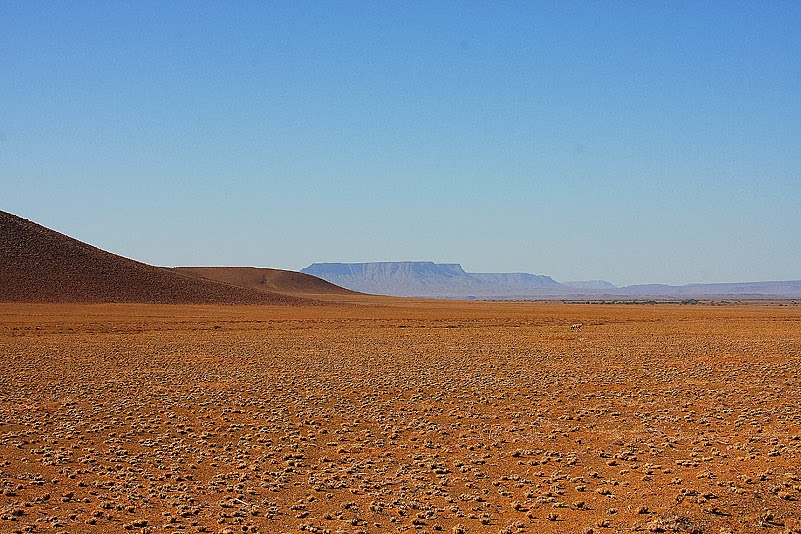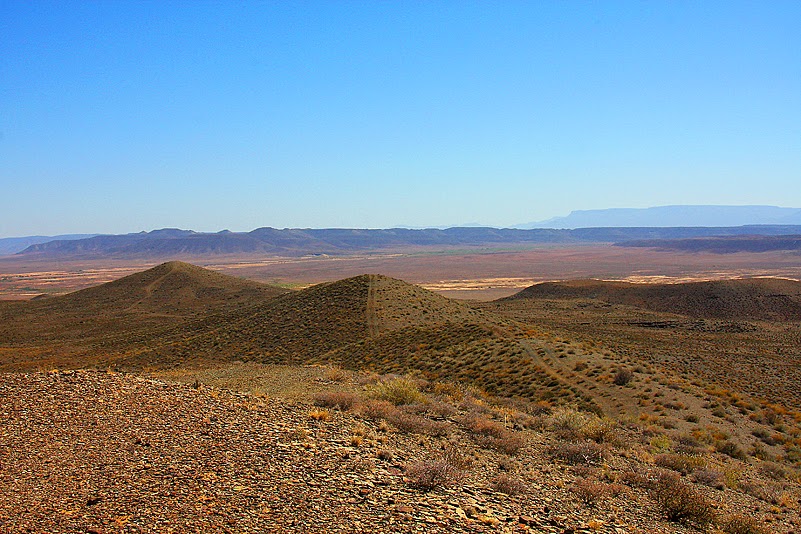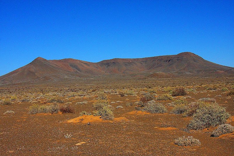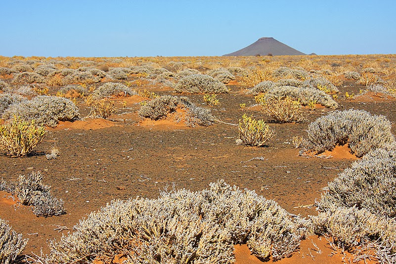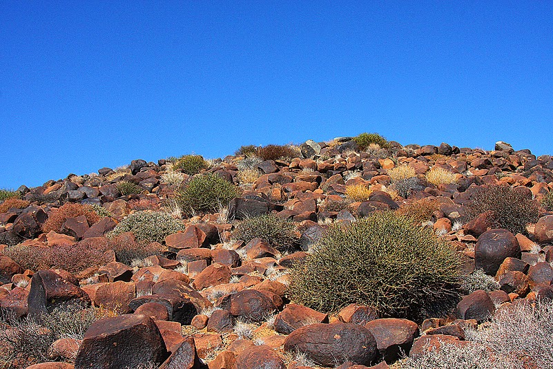 Über die geologische Herkunft der die Fläche bedeckenden Steine allerdings machen wir uns im Moment nur am Rande Gedanken, denn die felsigen Bruchstücke haben eine ganz besonders unangenehme, gemeinsame Eigenschaft, Geologie hin oder her: sie sind überwiegend von sehr dunkler Farbe, speichern somit extrem wirksam die Hitze der frühen Nachmittagssonne und geben diese in geballter Form wieder ab – an uns. Wir schwitzen wie die Schweine und fühlen uns beinahe wie Grillhähnchen – kurz vor der letzten Garstufe. Bevor wir also noch knusprig werden, verabschieden wir uns von der Füllhorn-Ebene und tuckern weiter. Ein kurzer Schlenker führt uns zunächst nach Varschfontein, wo ein in der Karte verzeichnetes Wasserloch tierische Abwechslung verheißt. Verheißung jedoch ist kein Versprechen, wie wir deutlich erkennen dürfen, als wir dort ankommen. Nichts los, aber so gar nix. Keine Antilope, kein Vogel und nein, nicht mal eine einzige interessante Pflanze. Recht schnell also verlassen wir den trügerischen Ort an der nördlichen Grenze des Nationalparks und machen uns wieder auf den Weg, zurück zum Camp.