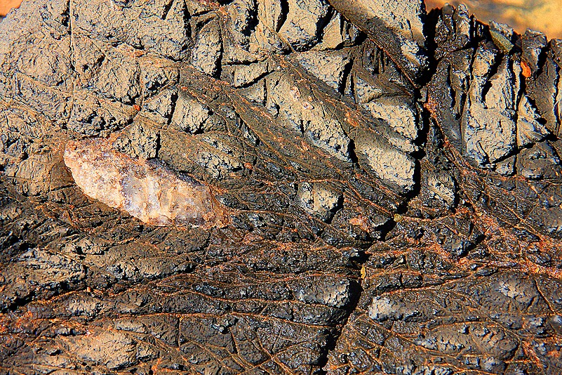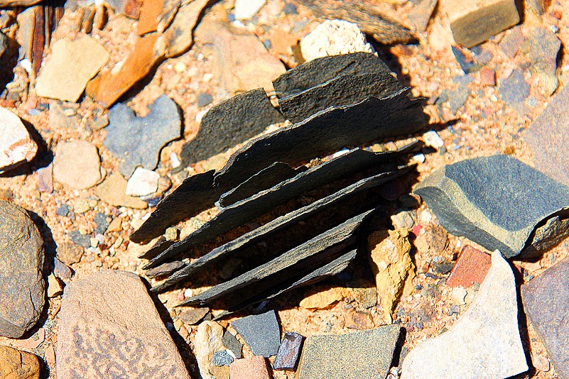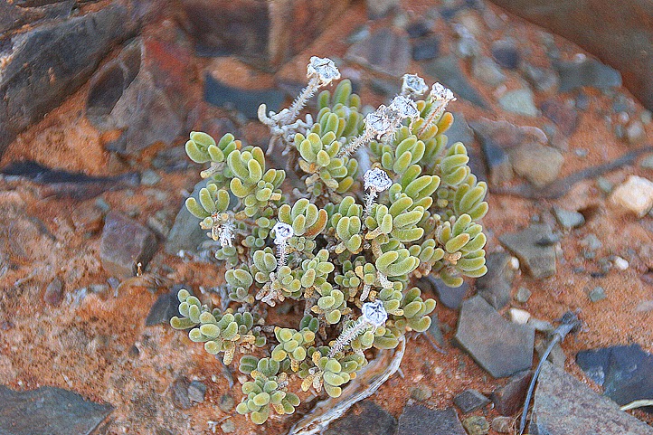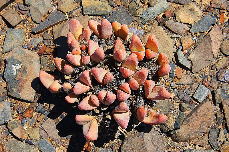 Nur nicht von Heinz. Der nämlich weiß genau, was ich da mache und auch warum. Glücklich lächelnd, so einen Partner zu haben und hoch zufrieden über das Ergebnis meiner Trocknungsaktion, packe ich den Pumpzerstäuber schließlich weg. Prädikat ungeeignet! So werde ich den Rest dieses Urlaubs – und der hat ja gerade erst begonnen – wohl lieber wieder Spucke verwenden. Für den nächsten Urlaub aber kommt eine Pipettenflasche ins Gepäck; allein schon wegen der unschönen Spuckebläschen auf den Fotos… Mit diesem beruhigenden Gedanken im Hinterkopf streife ich weiter über die Schieferebene und entdecke noch diverse andere Pflanzen, die ebenso schön wie bizarr sind, mir aber „erkennungsdienstlich“ sicher noch einiges abverlangen werden. Auch Heinz, der sofort sein neu erworbenes Buch gezückt hat, ist weitestgehend ratlos. Egal. Diese Geröllfläche ist auf jeden Fall eine botanische Fundgrube, wie sie schöner nicht sein könnte. Schön ist sie aber nicht nur, weil sie ein kleines Universum an Sukkulenten beherbergt, sondern auch wegen der auffälligen Steine, die geologisch hochinteressant sind: wir befinden uns hier auf einer Fläche, auf der sich zwei der ältesten Gesteine der Karoo-Gruppe gar pittoresk und sukkulentenfreundlich verteilt haben. Es mischen sich blau-grünliche Tonsteine und harte, dunkle Sandsteine der Ecca-Gruppe (290–260 Millionen Jahre) mit blaugrauem Tillit und schieferigem Siltstein der Dwyka-Gruppe (300–290 Millionen Jahre) und schaffen somit ideale Bedingungen – zum Beispiel für die Tanquana, die ausschließlich auf derartigen Böden gedeiht.