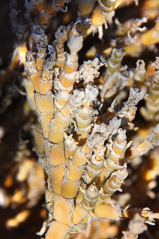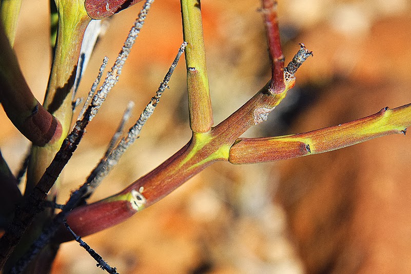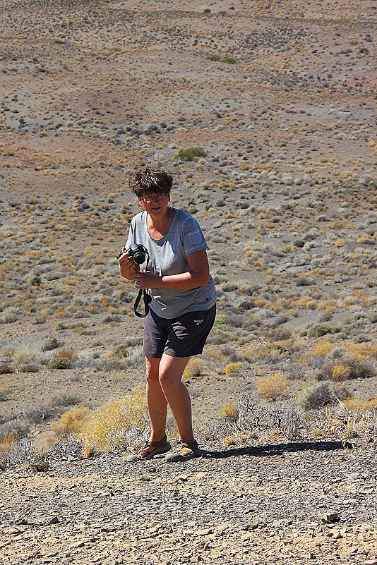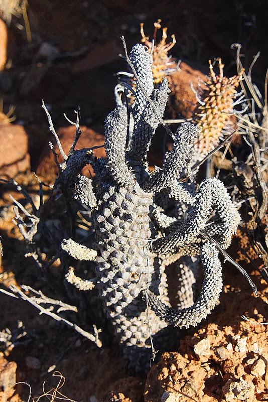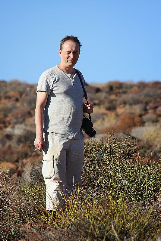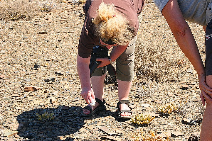 Eifrig besprühe, begutachte und fotografiere ich die Zauberknöpfchen und bin begeistert. Vielleicht finde ich so ja doch noch den Einstieg in die tieferen Weihen der Aizoaceen-Bestimmung. Das aber ist eine Sache, die ich mir für zuhause, für lange, dunkle Winterabende aufheben will, denn jetzt habe ich weder die richtige Literatur hierfür zur Hand noch die rechte Muse. Es gibt viel zu viel zu sehen! So also kraxle ich voller Tatendrang weiter, stoppe hier, knipse da und sprühe dort. Plötzlich stolpere ich beinahe über ein höchst interessantes Gebilde: eine stachelige Wurst mit diversen kleineren Seitentrieben auf halber Höhe. Das ist keine Hoodia, das muss eine Euphorbie sein, wie wir sie noch nie gesehen haben. Schneck, wo bist du?!? Minuten später kommt Heinz tatsächlich den Hügel herab und sieht sich meinen Fund an. „Mhm, ja“, sagt er, „das ist eine Euphorbie. So eine hatte ich weiter oben auch. Hab sie erst gar nicht gesehen, erst, als ich sie beinahe niedergepieselt hätte… Aber welche das genau ist, weiß ich leider auch nicht!“ Egal, wir werden es herausfinden, auch wenn die Pflanze aufgrund der heftigen Trockenheit schon etwas ramponiert aussieht. Beglückt über unseren Fund und den erfolgreichen Zwischenstopp, wandern wir langsam wieder nach unten, wo wir auf Annette stoßen, die sich gerade ein tierisches, schon recht trockenes, aber formschönes Häufchen näher besieht und rätselt, welches Wesen das wohl hinterlassen haben könnte. Sieht ja fast nach Katze aus, ein Caracal vielleicht? Pfotenabdrücke finden wir leider nicht. Dafür aber besprühe ich die Wurst kurzerhand mit meinem Zerstäuber, um sie wenigstens geruchlich wieder zum Leben zu erwecken. Puh, das war keine gute Idee! Eine streng riechende Wolke fährt in unsere Nasen und wir nehmen lieber etwas Abstand. Nun aber wissen wir wenigstens eines ganz sicher: es ist eindeutig Fleischfresserkot!