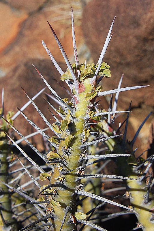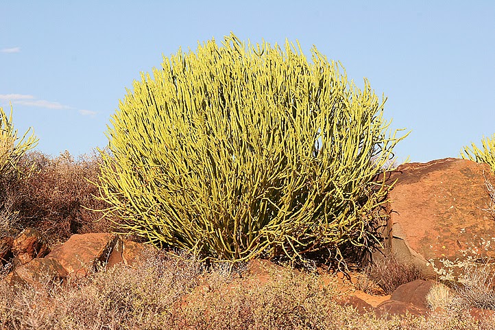 Mann, wenn man bedenkt, wie langsam solche Pflanzen wachsen, dann wird man richtig ehrfürchtig angesichts derartiger Prachtexemplare. Die müssen alle schon viele, viele Jahre auf dem Buckel haben! Bewundernd klettern wir durch die glühend heißen Felsen und wünschen uns im Geiste einen solchen Hügel im Garten zuhause, natürlich mit dem entsprechenden Klima… Das aber wird wohl allein beim Wunsch bleiben. Tja, wenn ich da an meine Schätzchen auf der Fensterbank denke, wird mir ganz wehmütig ums Herz: einerseits liebe ich ja unser Klima und den Wechsel der Jahreszeiten, andererseits dauern mich meine heimischen Exoten, wenn sie den Wachstumsrhythmus ihrer Heimat beibehalten. Beibehalten müssen, denn er ist in ihren Genen verankert. Ist hier Sommer, frostet bei uns zuhause der Winter. Egal, da wird in der südafrikanischen Heimat gewachsen, so also auch bei uns. Ein schwieriges Unterfangen jedoch, wenn lediglich die wenig kraftvolle Wintersonne ihren Dienst tut. Doch mehr als ein Südfenster kann ich meinen Lieblingen halt leider nicht bieten, freue mich aber umso mehr über jeden Zuwachs-Millimeter, den sich die Pflanzen fern der Heimat unter meiner Fürsorge erkämpfen. Deswegen ist es auch etwas ganz Besonderes, diese zähen Kämpfer in ihrer natürlichen Umgebung, in ihrem ursprünglichen Habitat, so strotzen zu sehen!