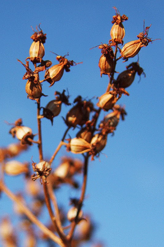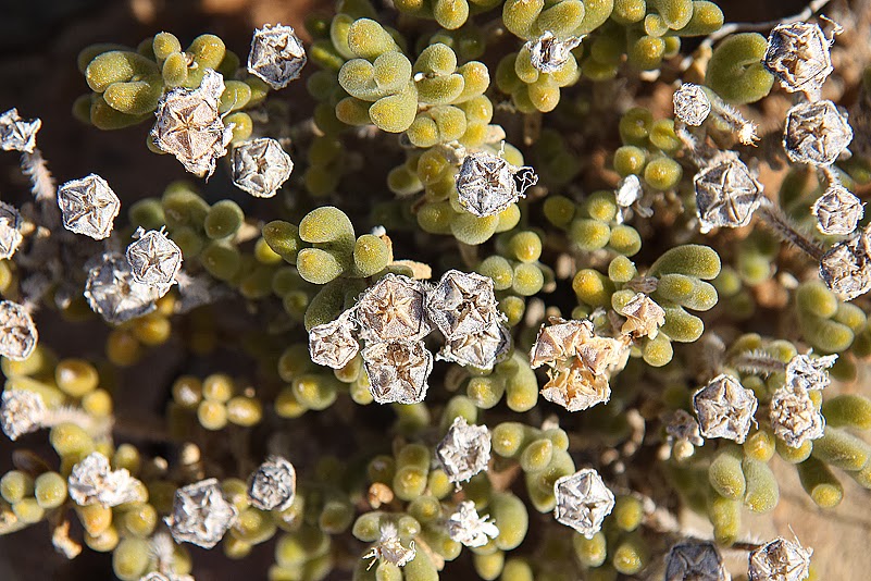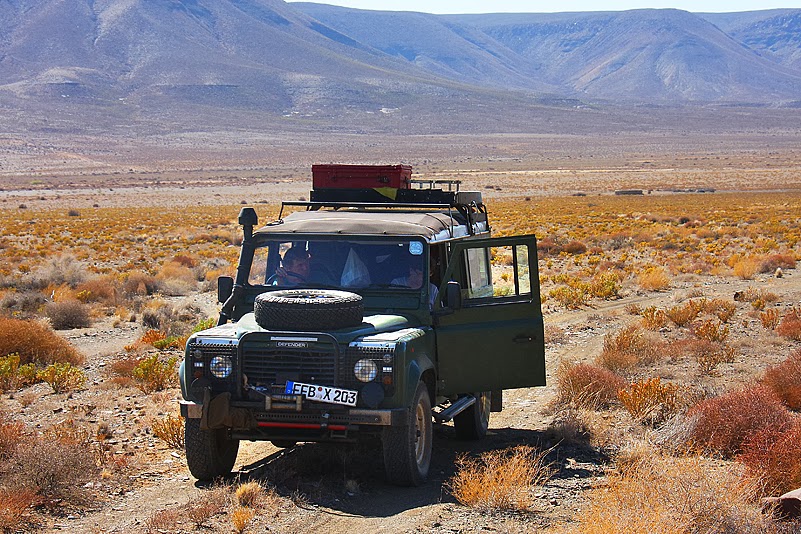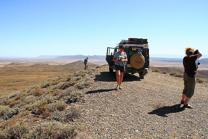 Sicher ist auch, dass die Aussicht von hier oben gigantisch ist. Leider, und das stelle ich im Nachhinein beim Sichten der Fotos fest, lässt sich das Ganze bildtechnisch nur unzureichend festhalten. Auch die Steigung der letzten Meter, die in etwa dreißig Grad betragen haben dürfte, flacht sich auf den Fotos deutlich ab. Komisch, es sind immer die abenteuerlichsten Passagen, die man so oder sogar in etwas übertriebener Weise im Gedächtnis behält, den Daheimgebliebenen jedoch nie in auch nur annähernder Form nahebringen kann. Tja, deswegen reist man wohl – um das alles hautnah erleben zu können. Mit zwei greif- und spürbaren Abgründen neben uns stehen wir nun also hier oben, genießen die Aussicht, lassen uns den Wind um die Nase wehen, recht viel mehr jedoch ist nicht zu tun, denn wir sind schon wieder in einer ziemlich vegetationsarmen Zone gelandet. Lediglich ein recht großer Codon, bereits reichlich mitgenommen durch die Trockenheit und seinen ausgesetzten Standort direkt an der schmalen Bergkante, präsentiert uns willig einige seiner stachelbewehrten Blätter und ein paar Samenkapseln, die ich so deutlich noch nie gesehen habe: wie hölzerne Tropfen thronen die Nüsschen inmitten einer perfekten Krallenfassung aus Kelchblättern. Ein Schmuckstück der Natur, das zu entdecken man schon sehr genau hinsehen muss. Genau hinsehen müssen wir übrigens auch, als wir wieder ins Auto gestiegen sind und uns auf den Weg hinab in die Ebene machen. Puh, ist das ein Gefälle! Manchmal sehen wir nur den Himmel durch die Windschutzscheibe, während sich die Vorderreifen bereits an der nächsten Abstiegskante befinden. Annette krallt sich vor Aufregung am Armaturenbrett fest, aber Jochen steuert den Landy sicher hinunter ins Tal.