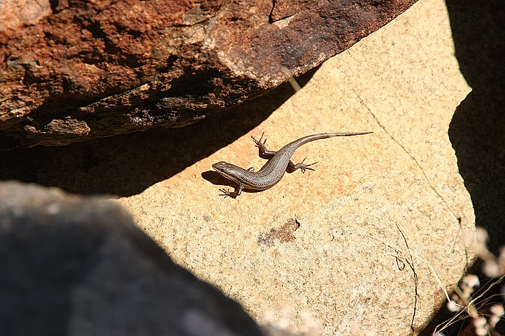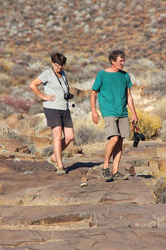 Heinz und ich erwachen am frühen Morgen vom Rumoren unserer Freunde, robben aus unserem Zelt und werden mit heißem Wasser und gedecktem Tisch in Empfang genommen. Relativ wortlos – was in unser aller Sinne ist, denn keiner von uns ist ein Freund großer Reden, so direkt nach dem Aufstehen. Und es ist immer wieder ein besonderes Erlebnis: bei Sonnenaufgang schweigend ein Frühstück zu genießen – frühstücken tu ich zuhause nur am Wochenende, gemeinsam mit meinem Schneck, aber sicher nicht bei Sonnenaufgang, eher deutlich später – und noch dazu mit zwei anderen, mir lieben Menschen – das hab ich zuhause auch selten – und das mitten im Busch – hab ich das ganze Jahr über nicht im Programm. Wenn dieser ganze erwachende Naturmorgen stillschweigend auf einen einwirken kann, mit all dem Insektengesumme, dem Nichtgerede, der erstaunlich schnell aus der Kühle des Morgens entstehenden Hitze – dann ist das reines, ungefiltertes Wohlgefühl, purer Genuss. Erst recht, da die nachtaktiven, angsteinflößenden Solifugen jetzt allesamt verschwunden sind und lieblicheren Geschöpfen Platz gemacht haben. In den Bäumen am Rande unserer Campsite tummeln sich laut schnatternd einige Webervögel, auf den sich aufheizenden Felsen flitzen zahlreiche Echsen umher und hin und wieder flappt ein bunter Schmetterling vorüber, obwohl weit und breit keine nennenswerte Blüte sichtbar ist. Ohne jegliche Eile genießen wir das Frühstück – einer der Vorzüge von Tagen, an denen wir keinen Campwechsel vornehmen müssen. Dann, als alle satt sind und wir unser Equipment gespült und sicher verstaut haben, machen wir uns langsam auf unsere geplante Erkundungstour im Park. Wir hätten es allerdings noch gut eine ganze Weile auch im Camp ausgehalten, wäre da nicht recht spezieller Besuch erschienen. Ein riesiger Schwarm winziger Bienen fiel schon bei den Frühstücksvorbereitungen über uns und unsere Lebensmittel her und es gestaltete sich etwas schwierig, einen Bissen oder die Tasse bienenfrei zum Munde zu führen. Die kleinen Insekten schienen zwar nicht stechen zu können (oder zu wollen), aber lästig waren sie auf Dauer trotzdem. Beim Abspülen jedoch kennt ihre Begeisterung dann erst recht keine Grenzen mehr: Wasser im Überfluss! In Trauben umsummen sie unsere nassen Hände, das gespülte Geschirr und schließlich auch das geleerte, aber noch feuchte Spülbecken. Freunde, vergnügt euch gerne mit der Restfeuchtigkeit, wir fahren dann mal, ja?! Gesagt, getan. Die kleinen, emsigen Immen hinter uns lassend, kurven wir aus unserem Tal Richtung Südwesten, schrecken einen langbeinigen Sekretär auf, der hektisch flatternd vor uns flieht, umrunden einen felsigen Hügel und durchfahren eine Art kleines Trockenflusstal. Hier sieht es aus, als könnte es sich lohnen, mal auszusteigen!