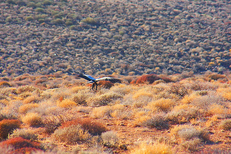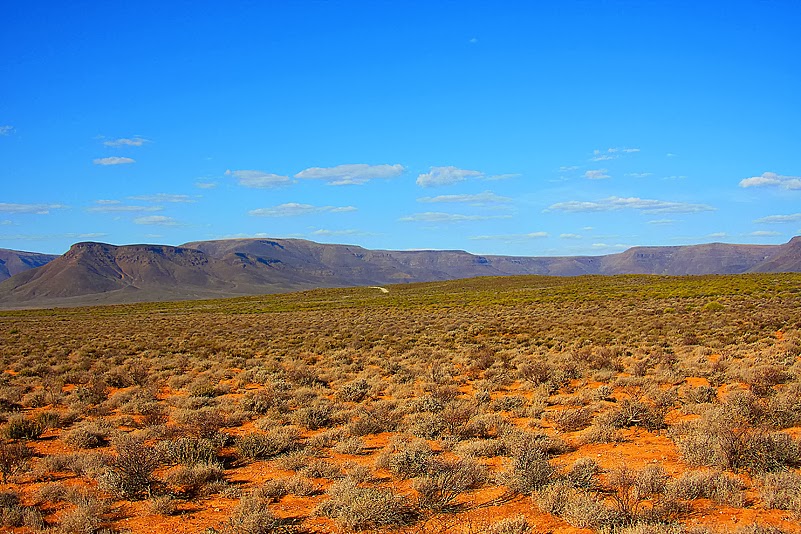 Die Route führt uns nun in westlicher Richtung über schier endlose Ebenen, die zu dieser Jahreszeit allesamt, naja, sagen wir mal, recht eintönig sind. Gut, es wachsen überall Pflanzen – die üblichen Verdächtigen wie Augeas – aber sonst… Es staubt, es ist heiß und die landschaftliche Schönheit der uns umgebenden Hügel leidet zudem ein wenig unter dem harten Licht der Sonne. Nach vielen Kilometern endlich, es ist bereits später Nachmittag, erreichen wir Abrahamsknie’e, ein weiteres Wasserloch, nicht weit von Skaapwagterspos, unserer Campsite. Und jetzt sieht die Szenerie schon deutlich plastischer aus: die Sonne neigt sich gen Horizont, taucht jede auch noch so kleine Erhebung in warmes, zeichnendes Licht, die Farben beginnen zu glühen, zu leuchten, und selbst die allgegenwärtigen Augeas werfen Schatten, die die Umrisse der proper-blättrigen Jochblattgewächse im milde wehenden Wind wie riesige, bebende Bäume erscheinen lassen. Lange treiben wir uns hier herum und jeder genießt etwas anderes. Jochen beispielsweise hatte das Wasserloch vor allen Dingen wegen der zu erwartenden Vögel angesteuert. Es sind auch einige da, leider aber lassen sie sich schlecht beobachten, denn der Trog, den sie zum Trinken und Baden nutzen, ist völlig freistehend und erschwert somit das unauffällige Anpirschen. Dennoch lässt sich Jochen nicht abschrecken, schleicht sich in großem Bogen an die Vögel heran und steckt mit seinem Tun auch Annette und Heinz an. Ich hingegen delektiere mich in der Zwischenzeit an den warmen Farbfacetten der Berge, die ihr Aussehen in der flach stehenden Sonne minütlich ändern und kann mich kaum sattsehen. Es ist einer der Momente, in denen ich mich von der Ewigkeit eingeholt und umfangen fühle, in denen irgendwie alles zeitlos erscheint. In diesem Zustand faszinierter Loslösung bemerke ich beinahe nicht, dass es immer kälter wird: die Sonne steht schon sehr tief, die Hitze des Tages bäumt sich in heftigen Thermikböen auf und ich bekomme Gänsehaut. Doch erst, als ich meinen Kopf unbewußt in einen ganz bestimmten Winkel zum Wind drehe, fällt mir die Temperaturänderung richtig auf: der stetige Luftstrom bläst an meinem Kopf vorbei und bringt meine kleinen Kreolen zum Pfeifen. Wie ein Tinnitus hört sich das an! Und der bringt mich wieder ins Hier und Jetzt, mitsamt der Gänsehaut, der Antwort meines Körpers auf die gesunkenen Temperaturen. Mit verschränkten Armen tauche ich deshalb schnell wieder bei meinen Reisegenossen auf, denen auch kalt ist. Wollen wir ins Camp fahren? Ja, das wollen und machen wir auch. Schließlich beginnt es schon zu dämmern – die Bienchen also dürften bereits in den Stock zurückgekehrt sein – dafür aber freuen wir uns auf die Sterne, auf ein ordentliches Abendessen und, ein klitzekleines bisschen sogar auf die zu erwartenden Solifugen…