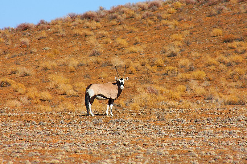 Jetzt aber wenden wir uns wieder ernsteren Dingen zu, klettern ins Auto uns fahren weiter westwärts. Die Landschaft wird hier wieder flacher und bedeutend vegetationsärmer. Das ist zwar schade, doch auf diese Weise machen wir wenigstens mal wieder ein paar Kilometer und lernen auch andere Teile des Parks kennen. Und sehen ein paar Tiere; einige Hörnchen, diverse Vögel, eine Oryx. Das war’s dann aber auch schon. Zudem sind die Tiere allesamt recht scheu, sodass wir ihren Anblick nicht mal ausgiebig genießen können. Jetzt dürfte allmählich mal wieder was passieren, denken wir uns gerade, als wir, nach vielen, recht ereignislosen Kilometern, unversehens an der nördlichen Parkgrenze ankommen. Von dort führt ein 4×4-Track Richtung Westen. Den will sich Jochen, der passionierte Geländefahrer, natürlich nicht entgehen lassen und biegt entschlossen ab. Zuerst ist die Strecke noch recht harmlos und Jochen beginnt bereits leicht ungeduldig zu werden; erst recht, als Heinz und ich ihn erneut um einen Stopp bitten. Wir passieren nämlich gerade den Fuß eines ausladenden, sehr felsigen Hügels, der von wundervollen Sukkulenten bewachsen ist. Riesige Euphorbienbüsche, knubbelige Tylecodons mit goldgelben, sich schälenden Stämmen und ausladende Sarcocaulon-Pflanzen, die zartgrüne Blättchen treiben.