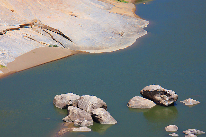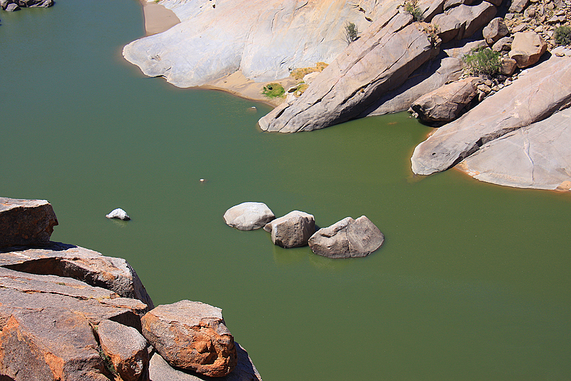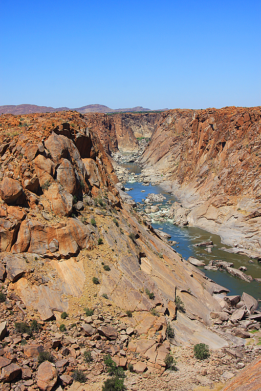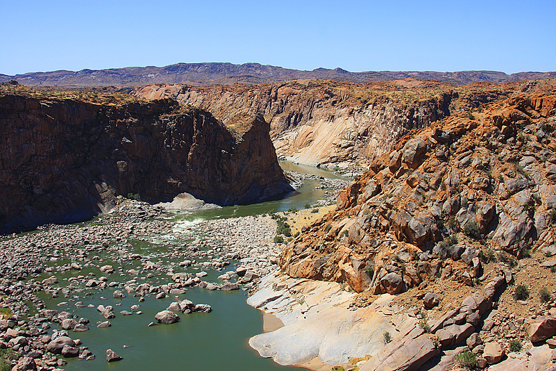 Und dann, endlich, erreichen wir Oranjekom, einen ausgewiesenen Aussichtspunkt oberhalb des Oranje, von wo aus man eine herrliche Sicht auf die tiefe Schlucht des Flusses und dessen oberflächlich ruhige Wasser hat – daran kann ich mich noch sehr gut von meinem lange zurückliegenden Besuch erinnern. Und natürlich, der Blick hat sich nicht verändert, dafür aber das Drumherum: wir stolperten und kletterten damals auf sehr ausgesetzten Felsen herum, um einen Blick auf die Oranjeschlucht erhaschen zu können. Heute hingegen gibt es hier eine fest gezimmerte Holzplattform mit allem Pipapo, inklusive Toilettenhäuschen, diverser Erklärungstäfelchen und einer Reling, auf der man beinahe Walzer tanzen könnte. Tja, was soll ich jetzt dazu sagen? Sicherlich war das Erlebnis Oranjeschlucht vor 22 Jahren aufgrund der noch nicht vorhandenen Convenience-Einrichtungen irgendwie hautnäher und auch abenteuerlicher, doch der hier präsentierte Besichtigungs-Komfort hat natürlich auch seine Vorteile: man kann jetzt, ohne sein Leben in Gefahr zu bringen, den eindrucksvollen Canyon des Oranje aus allen verfügbaren Blickwinkeln begutachten, sich völlig risikolos über die Reling hängen und alles total entspannt auf sich wirken lassen. Das hat schon was. Andererseits stört die Existenz des touristischen Bauwerks, das etwas leicht Gefängnisartiges an sich hat, mein Oranje-Erlebnis doch so empfindlich, dass ich mir alle Mühe geben muss, es auszublenden. Doch dann, als mir das erfolgreich gelungen ist, kann auch ich die Aussicht in vollen Zügen genießen. Meine Blicke gleiten über das vom Fluss geschaffene Tal, das die Spuren der beharrlichen Fräskraft des Oranje deutlich zur Schau trägt: auf Landniveau dominieren schroffe, raue Felsen, die nur von Wind und Wetter benagt wurden, darunter ragen glattgeschliffene, fast organisch anmutende Gesteinsstrukturen wie mächtige Wurzeln eines riesigen Urbaumes, wie wohlgerundete Finger in die Tiefen des Oranje hinab. Dieser gebärdet sich zu dieser Jahreszeit wie ein besonders sanftes Lamm – das träge dahinfließende Wasser betört vor allen Dingen mit seiner intensiven, changierenden Grün-Blau-Türkisfärbung; nur ein paar kleinere Stromschnellen lassen die unbändige Kraft des Flusses erahnen.