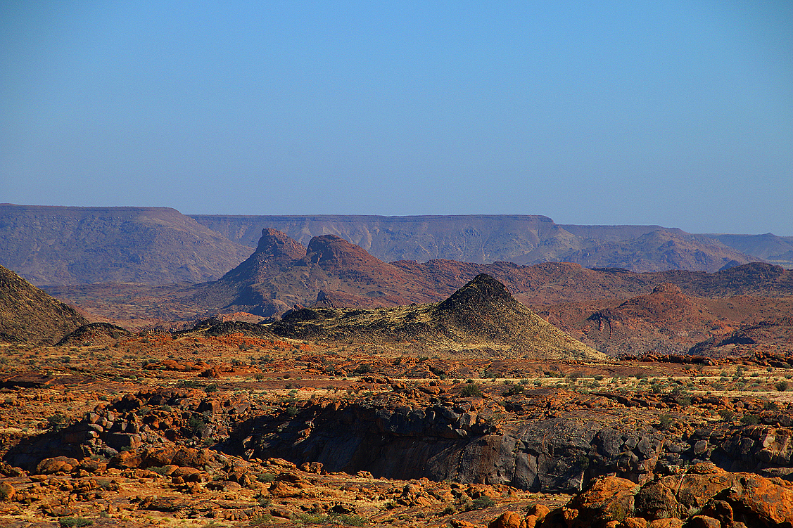 Die elf Kilometer lange Strecke dorthin führt uns über den sogenannten „Swartrante“, eine lange Kette von Hügeln, deren schwarzes Erstarrungsgestein eine natürliche Grenze zwischen der kargen Oranjeschlucht und dem dahinterliegenden, um einiges fruchtbareren Land bildet. Leider ist das Licht um diese Tageszeit so gleißend, dass der sicher reizvolle Kontrast zwischen den dusteren Felsen und der erkennbar üppigeren Vegetation im Hintergrund nur ungenügend zur Geltung kommt – man kann ihn allenfalls erahnen. Doch der Weg zurück wird uns abermals über Swartrante führen und vielleicht steht da die Sonne schon etwas günstiger; wir lassen es einfach auf uns zukommen…