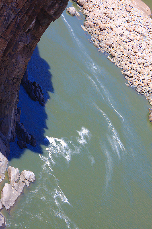 Ach, man kann es drehen und wenden, wie man will, es ist eben so, wie es ist und davon will ich mir das Vergnügen nicht verderben lassen. Und es ist wahrlich ein Vergnügen, einen Teil dieses mächtigen Flusses derart laut rauschend und gischtend auf seinem steilen Weg nach unten zu beobachten: das Wasser brandet in schaukelnden Wogen durch die enge Schlucht und, je nachdem, ob es gerade vor- oder zurückwogt und dabei auf das nächste Hindernis trifft, fällt das Ergebnis anders aus. Mal spritzt das Wasser beim Aufprall in einem pfauenradartigen Fächer steil nach oben, mal klatscht es sprühend an die Felsen und hin und wieder sieht es sogar aus, als würde es, beinahe zaghaft schwappend, den Rückweg nach oben antreten. Dieses Zusammenspiel von horizontaler und vertikaler Wasserbewegung, der enormen Fließgeschwindigkeit und der Statik der Hindernisse erzeugt wiederkehrende und dennoch immer neue Gischtformen, die, wenn man sich nur lange genug darin vertieft, spannend wabernde Bilder erzeugen. Daran hätten wahrscheinlich auch Chaosforscher und Statistiker ihre wahre Freude!
