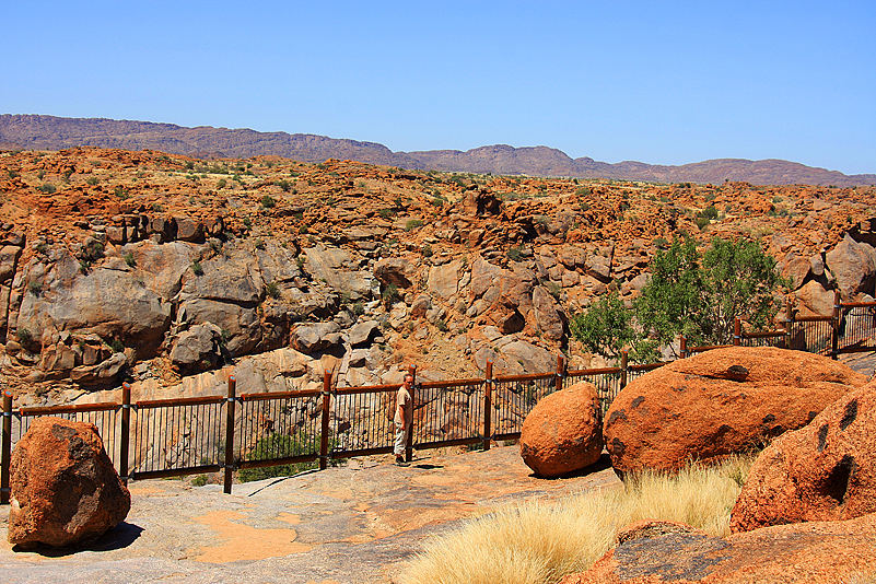 Bedauernd klappe ich meine tranceartige Gedankenflut in den Hinterkopf zurück, ergebe mich jedoch willfährig: wir verlassen Oranjekom, um, tja, um dem nächsten Ziel zuzustreben. Wenn es hierbei nach Jochen ginge, wäre dies das Camp, doch diesem heimlichen, weil nicht geäußerten Wunsch wollen wir anderen nicht nachkommen, zumindest nicht sofort. Denn wenn wir schon hier sind, möchten wir gerne auch noch nach Ararat, einem weiteren Aussichtspunkt am Oranje-Ufer, der ohnehin auf dem Weg liegt. Seufzend wird unserem Begehren stattgegeben und so erreichen wir eine Viertelstunde später diese letzte Sehenswürdigkeit auf unserem heutigen Ausflug. Und auch hier wurde oberhalb des Flusses ein touristisches Bollwerk oberster Güte errichtet; der Blick auf den Oranje ist verständlicherweise ebenso imposant wie vom Oranjekom, der ja auch nur ein paar hundert Meter Luftlinie entfernt ist. Für den flüchtigen Betrachter mag sich die Sicht vom zweiten View Point aus deshalb auch kaum von der ersten unterscheiden, doch dem ist nicht so: bei Ararat sind die Felsen noch organischer geschliffen, die Wasseroberfläche, abgesehen von partiellen Verwirbelungen, ist nahezu spiegelglatt und man kann den Oranje förmlich durchatmen hören. Durchatmen, nachdem er sich einen Kilometer weiter östlich aus mehreren Armen, die sich vorher todesmutig in unzählige, enge Kanäle gezwängt und über eine 56 Meter hohe Gesteinsschwelle kaskadierend in die Tiefe gestürzt hatten, wieder zu einem einzigen vereint hat.