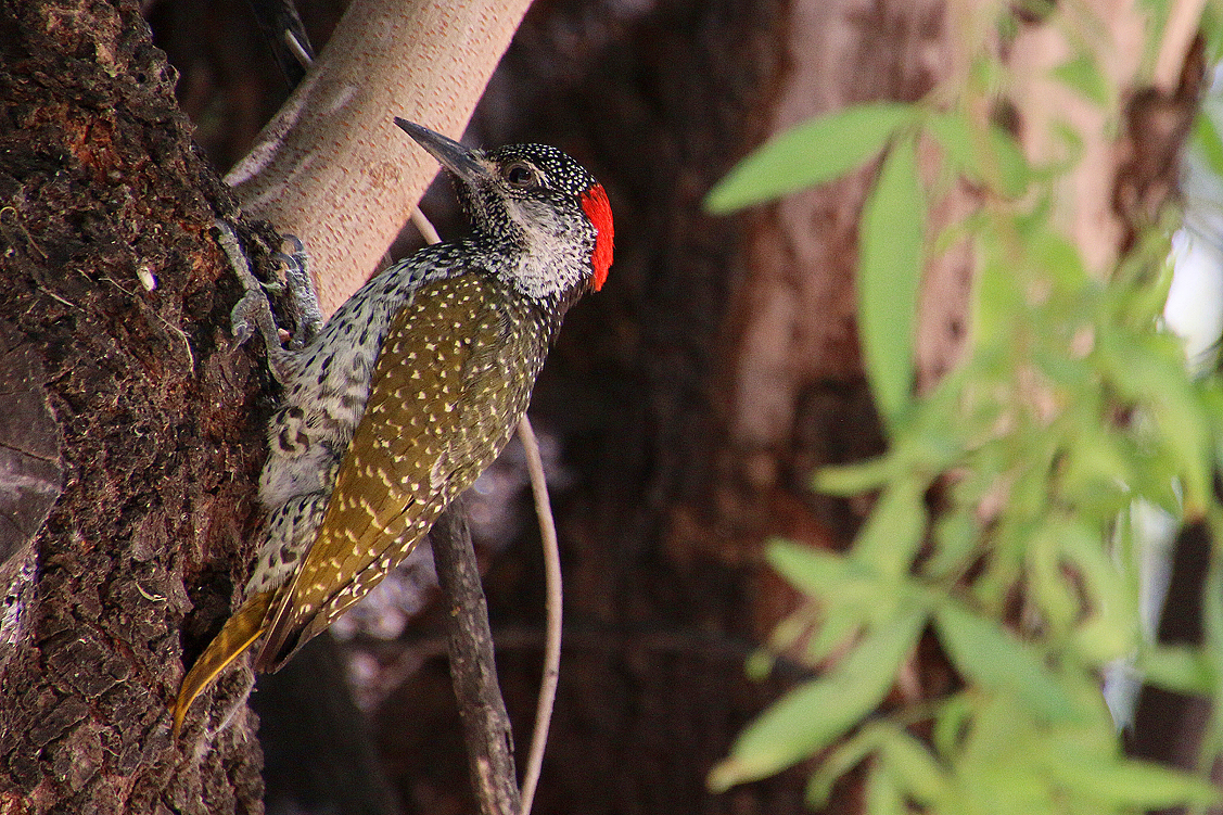 Wir lassen uns zu ihnen plumpsen und kredenzen erst mal die Kaltgetränke, die wir aus dem Shop mitgebracht haben. Mit großem Genuss lassen wir uns die kühle Zuckerplörre die Kehlen hinabrinnen und setzen gerade an, von unserem Ausflug zu erzählen, als ein stakkatoartiges Hämmern unsere Aufmerksamkeit auf sich zieht: das muss ein Specht sein! Schon gestern hatten wir etwas klopfen und fiepen gehört, konnten es aber nicht genau lokalisieren. Heute jedoch können wir die Geräuschquelle ganz deutlich orten – es ist der große Baum vor dem Waschhaus. Vorsichtig nähern wir uns diesem und entdecken an dessen Stamm tatsächlich den Klopfer. Uih, das ist ein Goldschwanzspecht! So einen haben wir noch nie vorher gesehen! Fasziniert beobachten wir den bunten Vogel, der wie auf Schienen am Stamm entlangrutscht, hier und dort an der Rinde hämmert, um dann mit vollem Schnabel in einem Loch zu verschwinden. Augenblicklich ertönt aufgeregtes Fiepen – aha, der Specht hat Nachwuchs – hatten wir uns gestern doch nicht getäuscht! Glücklich über diese Entdeckung lassen wir den Elternvogel lieber wieder in Ruhe und kehren zum Tisch zurück, wo wir den Baum dennoch nicht aus den Augen lassen. Zumindest so lange nicht, bis hinter uns, auf einem breiten Grasstreifen, eine Schar von Klippschliefern auftaucht. Die Dassies ziehen, wie Kühe grasend, über die Wiese, werfen sich immer wieder in die grünen Halme, wälzen sich wonniglich, verfolgen sich gegenseitig mit kaninchenartigen Hopsern und gebärden sich äußerst ausgelassen.