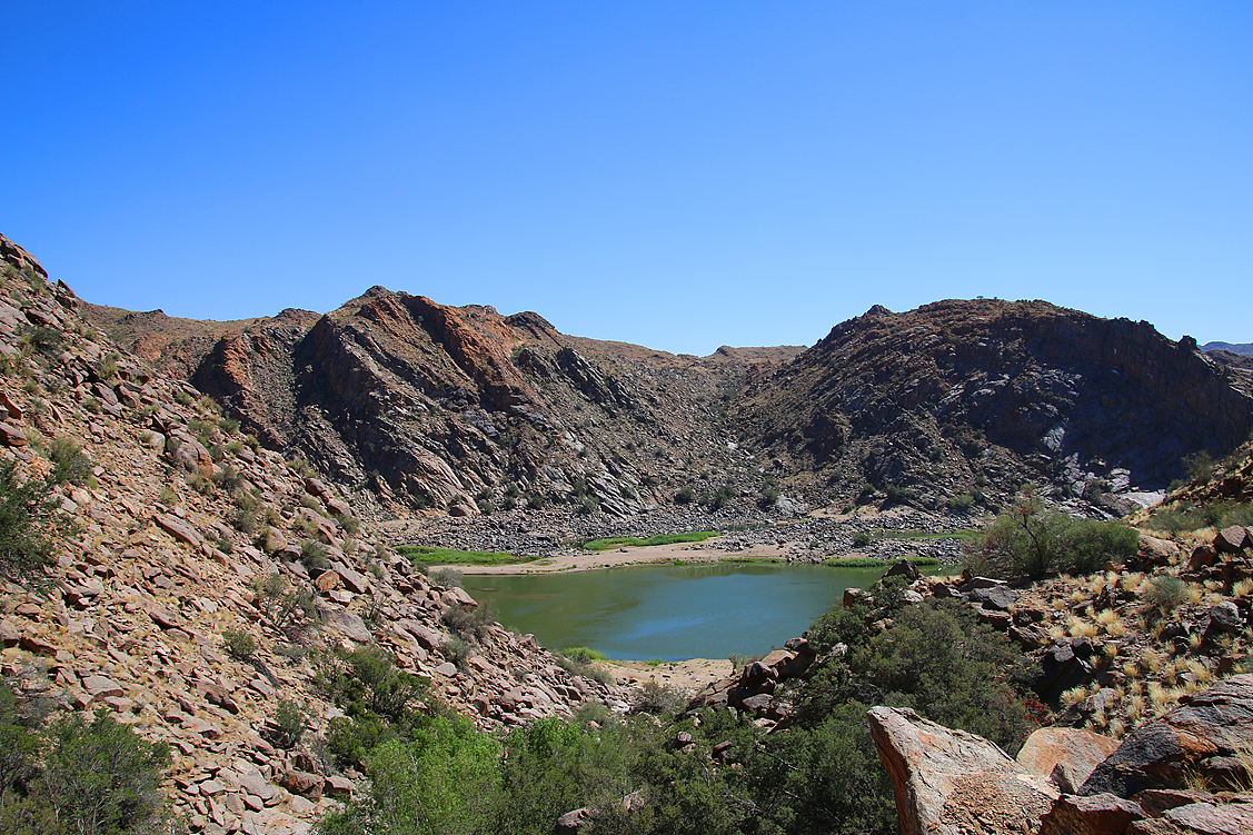 Rund um uns ragen schroffe, sandfarbene Bergwände nach oben, zu unseren Füßen glitzert das Wasser des Oranje in kontrastierenden Türkis- und Grüntönen – die tümpelartigen Becken geben sich allerdings nicht als Teil eines mächtigen, fließenden Flusses zu erkennen, sondern strahlen eher die Ruhe tiefer, stiller Tümpel aus – und dieses an sich schon reizvolle Szenario wird zusätzlich durch die üppige Blütenpracht der zahlreich gedeihenden Schotien-Bäume akzentuiert. So schön – und auch dieser Ort verbreitet eine geradezu einlullende Stille, wie sie uns die letzten Wochen schon mehrmals begegnet war.