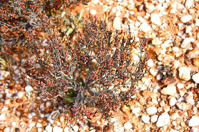 So also robbe ich auf allen Vieren weiter über die kantigen Quarzkiesel, wohl geschützt durch meine Kniepolster. Nächstes Mal allerdings, so merke ich im Urlaubslappen meines Kleinhirns vor, brauche ich auch noch Ellbogenschützer… Heute jedoch muss es ohne diese Bequemlichkeit gehen – was es auch tut, denn die Flut der Eindrücke lenkt von allem anderen Ungemach ab. Auch die Hitze spüren wir nicht wirklich. Wir sind zwar nun schon über vier Stunden bei erbarmungslosem Sonnenschein und Temperaturen um die 35 Grad unterwegs, dennoch fühlen wir uns frisch und aufs Trefflichste unterhalten. Nur die Viskosität der Spucke leidet ein wenig unter unserer Dehydrierung – das bemerke ich schließlich recht deutlich beim Befeuchten der diversen Samenkapseln… Doch da hinten, vielleicht in einem halben Kilometer Entfernung, kann man eine Art Schattendach erkennen, und das steuere ich nun an, um dort Wasser nachzutanken und ein wenig Schatten zu finden. Langsam nämlich spüre ich die Wirkung der Sonne ordentlich auf meiner blassen, europäischen Winterhaut. Mein Gesicht brennt, wenn ich mir den Schweiß von der Stirne wische und meine Fußriste leuchten in ungesundem Rot. Eine kurze Schattenpause später aber, frisch gecremt und mit einem halben Liter Wasser intus, geht es munter weiter. Und, als ich den kleinen Rastplatz verlasse, kriege ich endlich auch meine Freunde wieder zu Gesicht. Wir hatten uns weit verstreut, jetzt aber, da wir wieder Sichtkontakt haben, verständigen wir uns auf eine allmähliche Rückkehr zum parkenden Wagen. Wird auch Zeit, denn wir sind recht weit gegangen – zwar im Zickzack, die Luftlinie ist wesentlich kürzer – aber weiter als nur ein Steinwurf war es trotzdem.