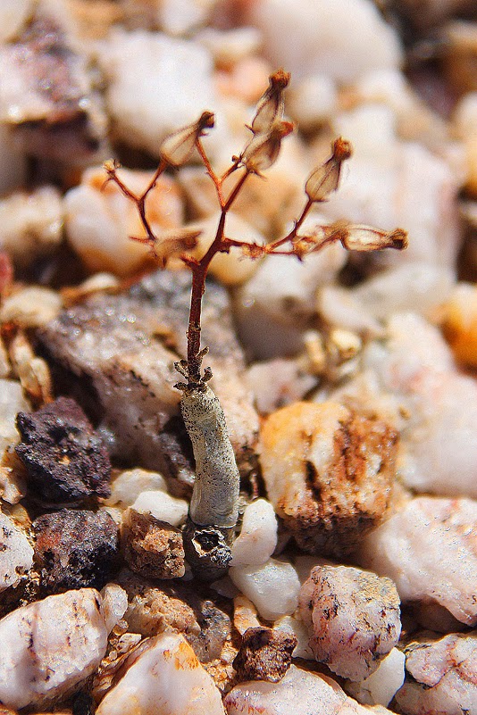 Einige auffällige Ausreißer aber gibt es immer, so auch hier: Da sind Argyrodermas, die tatsächlich grüne Blätter haben und fast wie eine Cheiridopsis aussehen, niedrig-krauchende Salsolas, die wir dieserorts so gar nicht erwartet hätten, Oophytums, die sich in tiefem Schlafe befinden, strotzende Sarcocornias, winzige Tylecodons, holzige Monilarias und immer wieder Crassulas, meine absoluten Lieblinge. Eigentlich. Denn mittlerweile bin ich von den anderen Sukkulenten mindestens ebenso fasziniert. Hier ist jede Pflanze so bizarr in Wuchs und Form, so eigen in ihrer Farbe, so hinreissend in ihrer Winzigkeit, so fesselnd in ihrer ureigenen Schönheit, dass ich sie alle am liebsten küssen möchte. Es ist wirklich fast unmöglich, meine Gefühle angesichts dieser kleinen Juwelen in Worte zu fassen, aber versuchen werde ich es trotzdem. Es ist eine Kombination aus Bewunderung für die Zähigkeit der Pflanzen, die eine fast mütterliche Zuneigung in mir hervorruft und das ehrfürchtige Staunen, das die Perfektion der Formen und Farben provoziert, das hat etwas beinahe Erotisches – im weitesten Sinne.