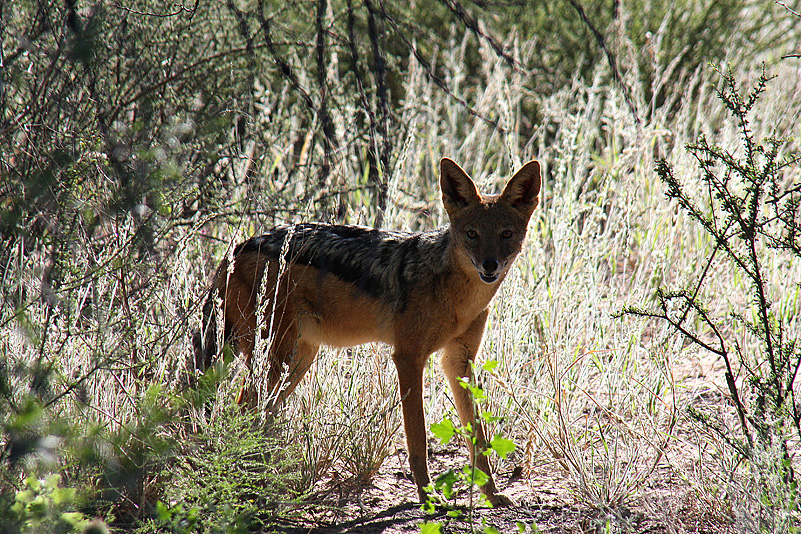 Doch das werden wir wohl nie erfahren. Trotzdem lassen wir uns das Frühstück schmecken, brechen wohlgelaunt das Lager ab und machen uns, mit großer Hoffnung auf einen abwechslungsreichen Tag, auf den Weg zu unserem nächsten Etappenziel, der Masetleng Pan. Kaum kurven wir aus unserem Camp heraus, blockiert auch schon ein Schakal die Pad. Der Atmer? Wie angewurzelt steht er da und starrt uns an. Dann geht ein Ruck durch seinen Körper, er dreht sich um und schnürt bestimmt einen halben Kilometer leichtpfotig vor uns her, bis er schließlich doch im dichten Gebüsch verschwindet. Kurz darauf stoßen wir auf eine kleine Oryxherde, die einen Kindergarten mit sich führt. Aus großen braunen Augen werden wir gemustert, als ungefährlich eingestuft und danach einfach nicht mehr beachtet. Wir erfreuen uns an der Unscheuheit der großen Antilopen mit der markanten Gesichtszeichnung und deren fluffigem Nachwuchs, in dessen Fell man auch schon deutlich die dunklen Streifen erkennen kann. Hah, denken wir, dieser Tag fängt ja ganz hervorragend an; so darf es weitergehen! Doch unsere Freude währt nicht lange. Das Gerumpel, das uns bereits gestern so ermüdet hatte, geht nämlich erneut los. Wieder holpern wir Kilometer um Kilometer durch dichtes, scheinbar unbelebtes Buschland, Meile um Meile zerrt die ereignislose Fahrerei mehr an unserer Konzentration und Geduld. Besonders Heinz ist ziemlich genervt – er kann wegen des Geholpers nicht schlafen und sich nicht, wenigstens per Traum, in die Zauberwelt der vergangenen Tage flüchten. Und auch ich fühle eine gewisse Teilnahmslosigkeit in mir aufsteigen. Doch bevor die lauernde Lethargie Gelegenheit bekommt, von uns allen Besitz zu ergreifen, erreichen wir Kaa Gate, den nördlichen Ausgang des KTP. Wir erledigen die Auscheck-Formalitäten und sind fast dankbar für diese Abwechslung, die uns der Papierkram bietet. Allzu rasch allerdings ist das Nötige erledigt und erneut finden wir uns auf der Piste wieder.