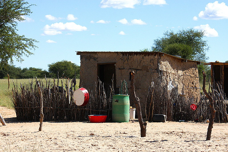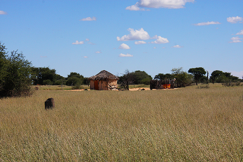 Also, Kopf hoch, Augen geradeaus und das Wenige, das sich uns darbietet, aufsaugen. Leicht gesagt, mühevoll getan. Wenig später, wir sind schon wieder ins übliche Buschland abgetaucht, erreichen wir Ngwatle. Ein winziges Dorf in den unendlichen Weiten der Kalahari und eine der insgesamt drei Communities, die das KD1 managen. Hier kommen recht selten Touristen vorbei und so ist es kein Wunder, dass uns sogleich ganze Heerscharen nackter Kinder entgegengesprungen kommen. Kreischend und lachend geleiten sie uns durch das Dorf, wo wir das Gebäude suchen, in dem wir unsere Übernachtungsgebühr entrichten können. Und obwohl kein Schild das gesuchte Office, das eigentlich ein Wohnhaus ist, kennzeichnet, so finden wir es beinahe sofort: es ist das einzige ziegelgemauerte Bauwerk weit und breit. Wie auch bei uns, ist hier die Stellung der jeweiligen Bewohner innerhalb der Siedlungshierarchie sofort zu erkennen. Die uns bekannten Immobilientypen Hochhaus, Reihenhaus, Einfamilienhaus, Villa (grob vereinfacht), sehen hier zwar deutlich anders aus, tun aber ebenso offensichtlich kund, wer Geld und was zu sagen hat und wer nicht – vielleicht sogar noch deutlicher, als das in unserer Heimat ersichtlich ist. Runde Lehmhütten, mit Brettern verstärkte eckige Lehmhütten, Wellblechschuppen; so ist die Staffelung in Ngwatle. Der Ziegelbau entspricht in diesem Falle der Villa; dort sollten, nach Adam Riese, wichtige, tonangebende Menschen wohnen. Und richtig! Sofort schreitet uns die Dame des Hauses entgegen – die Kinder halten respektvollen Abstand – und kassiert uns ab, bevor wir, begleitet von freundlichen Wünschen und quiekenden Kindern, erneut ins unbewohnte Buschland entlassen werden.
