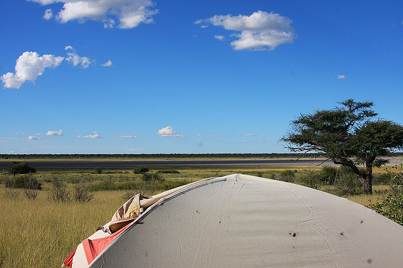 Doch, so schön unser Standort gerade auch ist, langsam sollten wir uns wieder auf den Weg machen und einen Lagerplatz für heute Nacht suchen. Es soll hier ja eine Campsite geben – die haben wir zwar schon vor vier Jahren vergeblich gesucht und stattdessen unsere Zelte am südlichen Pfannenrand aufgeschlagen, da, wo jetzt die Springböcke stehen. Heuer allerdings ist die Vegetation sehr viel dichter und unser ehemaliges Nachtquartier von strotzend grünen Pflanzenpolstern bewachsen, die wir auf keinen Fall beschädigen möchten. Also machen wir uns erneut auf die Suche nach der ominösen Campsite. Doch wie auch damals schon umkurven wir wieder die nördliche Seite der Pan, stoßen auf einer kleinen Anhöhe abermals auf das verwitterte Camp-Hinweisschild – und landen, déjà-vu-mäßig, im dichtgrasigen Nichts. Verdammt, das Schild zeigte eindeutig in diese Richtung, genau hierher, aber die Fahrspur endet im Nichts und es ist beim besten Willen keine Campsite zu erkennen. Trotzdem fahren weiter durch den Dschungel der Halme, so lange, bis zwei große Bäume unserem Fortkommen ein abruptes Ende setzen. Na gut, dann schlagen wir eben hier unser Nachtlager auf! Das jedoch ist schneller gesagt als getan: wenn nämlich unsere Zelte einigermaßen gut stehen sollen und wir nicht die ganze Pfanne abfackeln wollen, müssen wir zuerst das trockene Gras großflächig eliminieren. Seufzend roden wir also zunächst zwei kleinere Areale für die Zelte und ein sehr ausgedehntes fürs Lagerfeuer, bevor wir uns wohnlich einrichten. Während Heinz im Anschluss noch zwei En-suite-Klolöcher direkt neben den Zelten gräbt, bauen Annette und ich das Küchenequipment auf und Jochen macht sich auf die Suche nach Brennholz. Mit ein paar armdicken Baumteilen kehrt er wieder – dennoch erkennbar unzufrieden – erspäht dann aber den mächtigen, dürren Ast, der in gut zweieinhalb Metern Höhe genau die Stelle überragt, unter der wir Frauen am Tisch sitzen und Vorbereitungen für das Abendessen treffen. Mit offenen Mündern beobachten wir ungläubig, wie sich Jochen mit der Axt auf den Baum schwingt und an besagtem Ast zu schaffen macht und Heinz, voller guter Absichten, sich als Gewicht daran hängt, mit den Beinen fast über unserem Essplatz baumelnd. „Aber sonst ist alles okay mit euch, ja?!?“ „Wir brauchen Holz!“, keucht Jochen und hackt unverdrossen auf den Ast ein. Kopfschüttelnd versetzen Annette und ich den Tisch ein paar Meter nach hinten, um das Tun unserer Männer fernab der Gefahrenzone skeptisch weiter beobachten zu können. Der Ast jedoch ist widerspenstig, die Axt stumpf und Heinz definitiv zu leicht, um die Demontage des Brennmaterials entscheidend voranzutreiben. Als sich nach einer Viertelstunde immer noch nichts bewegen will, klettert Jochen schließlich entnervt vom Baum. „Schweres Gerät muss her!“, schnaubt er und hechtet zum Auto, um die Abschleppschlinge hervorzuholen. „Nein, halt, hallo, ihr spinnt wohl!“, intervenieren wir, „Wir brauchen doch keinen Scheiterhaufen, um unsere vier Steaks zu braten! Schluss jetzt!“ Unser Machtwort zeigt erstaunlicherweise tatsächlich Wirkung, Jochen lässt von seinem Vorhaben ab – wenn auch nicht gerne, so doch wenigstens einsichtig –, Heinz hüpft mit zerschundenen Händen auf den Boden und Minuten später lodert ein gemütliches Feuer durchaus akzeptabler Größe in der dafür vorgesehenen Sandkuhle.