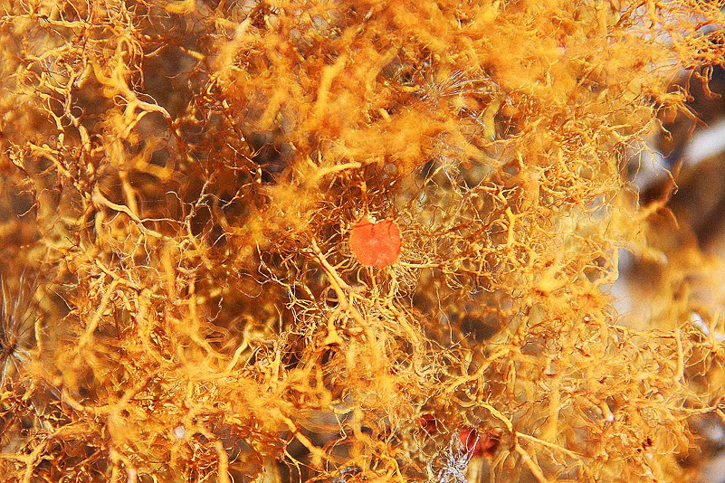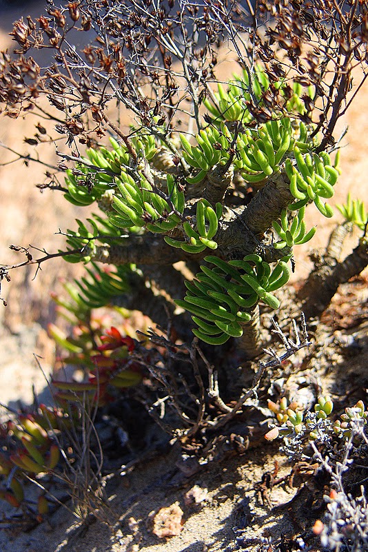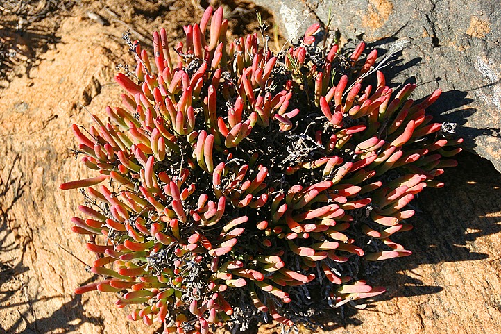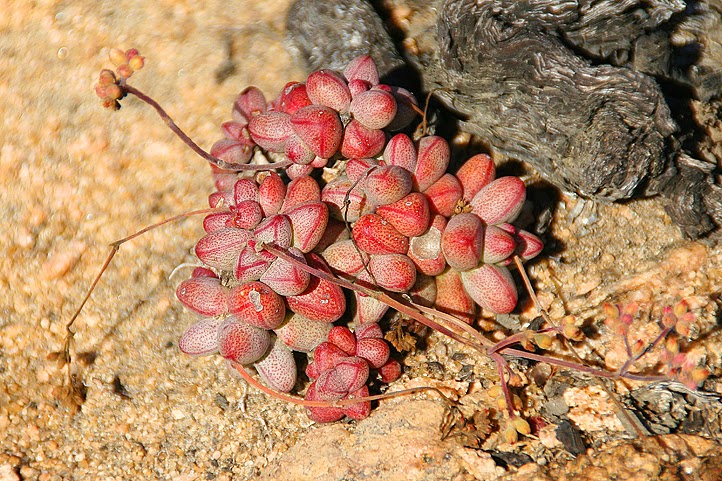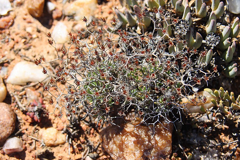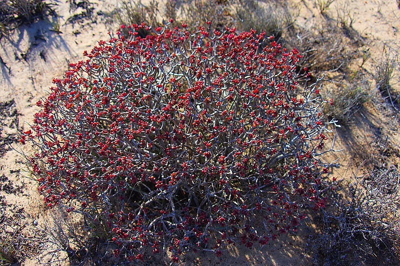 Weit kommen wir aber nicht, denn wir müssen ja das Euphorbienfeld, das wir gestern während des Strandspaziergangs entdeckt hatten, unter die Lupe nehmen – und das war nicht weiter als drei Kilometer vom Camp entfernt. Und ja, da ist es! Ein großes Areal, flach, sandig, mit Gesträuch bewachsen – und dazwischen schmiegen sich die Wolfsmilchgewächse auf den Boden. Es sind Medusenhäupter! Ihre Wuchsform – ein zentraler „Stamm“, dem zahlreiche Triebe kreisförmig, wie kleine Schlangen, entspringen – brachte ihnen diesen Namen ein: nach Medusa, einer der Gorgonen, einem Ungeheuer der griechischen Sagenwelt, deren Haupt von Dutzenden von Schlangen umstanden war. Die Namensgebung ist tatsächlich äußerst nachvollziehbar, ungeheuerlich jedoch ist allenfalls, wie viele Medusenhäupter es hier gibt. Heinz und ich laufen in unserer Begeisterung von einer Pflanze zur anderen und entdecken dabei natürlich auch noch weitere interessante Gewächse. Stammsukkulente Pelargonien, deren dicke Gnubbelstöcke zwar blattlose Zweige, dafür aber weiße Blütchen tragen, dicke Kissen von hochsukkulenten Aizoaceen, strauchige Crassulaceen und eine nahe Verwandte der gestrigen Killerflechte. Auch sie ist von grell orangener Farbe, wächst aber auf dem Boden und tut niemandem etwas zu Leide. Und schön ist sie noch dazu: einem zarten Gespinst orangefarbener Zweiglein entspringen kleine, rote Schüsselchen, die von langen Stielen getragen werden – fast wie im Zirkus, wo Jongleure Teller auf Stangen hoch über dem Kopf balancieren.