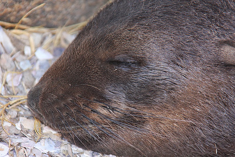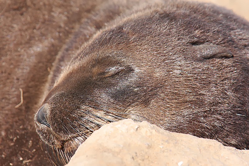 Ein bisschen fühlen wir uns hier wie illegale Eindringlinge, da wir aber offenbar für die Tiere nicht existent sind und sie somit auch nicht stören, verdrängen wir dieses Gefühl erfolgreich. Bis zu dem Zeitpunkt, als einen halben Meter neben mir, aus einer schwer einsehbaren Mulde, ein klagendes Grunzen ertönt: erschrocken beuge ich mich vorsichtig über den überhängenden Felsen, auf dem ich sitze, und blicke direkt in die verklebten Augen eines noch sehr jungen Seebären, der hier mutterseelenalleine in der glühenden Sonne liegt und sich schnaufend und stöhnend in seiner Kuhle windet. Der Kleine sieht nicht wirklich gesund aus und die Tatsache, dass er ganz alleine ist, weckt die Befürchtung in mir, dass er am Sterben, zumindest aber sehr krank ist. Jetzt fühle ich mich wirklich wie ein Voyeur! Rasch ziehe ich meinen Kopf zurück; wohl zu rasch, denn der Miniseebär erschrickt, grunzt unwillig und macht sich anschließend erstaunlich hurtig aus dem Staub – hinab zur Mama, die ihn liebevoll in Empfang nimmt. Mhm, hab ich jetzt ein krankes Tier aufgescheucht oder ein gesundes aus seinen Träumen gerissen? Wie dem auch sei; es tut mir von Herzen leid.