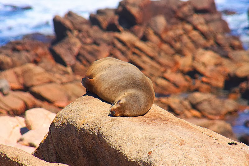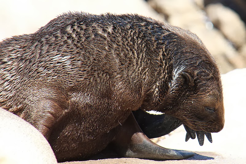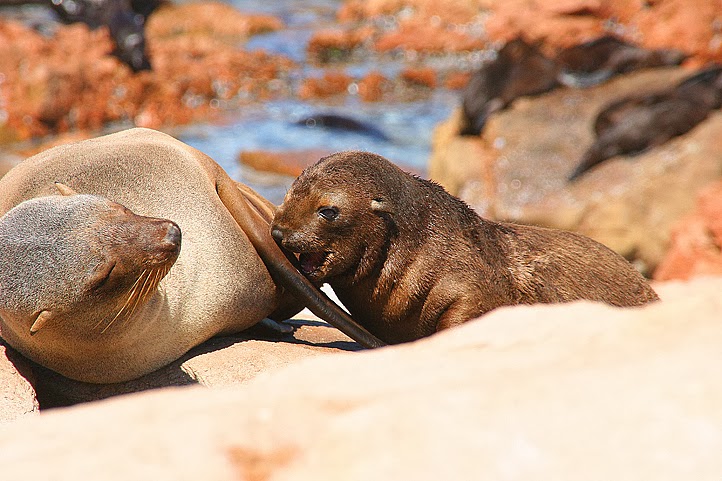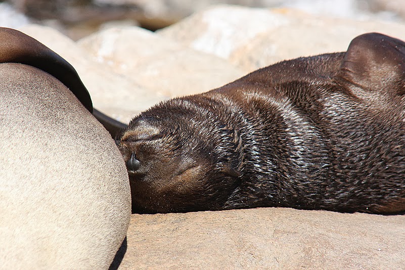 Wir sind zuerst nicht ganz sicher, ob wir die richtige Abzweigung genommen haben, bald aber sagt uns ein recht intensiver Geruch, dass wir durchaus nicht falsch liegen. Ein paar Kurven noch und unsere Augen erhalten ebenfalls die Bestätigung: in einer kleinen Bucht tummeln sich Hunderte der pelzigen Tiere, Alte, Junge, Badende und sich Sonnende. Und der Wind meint es gut mit uns, zumindest, was unsere eigene Witterung anbelangt: bis auf wenige Meter können wir uns den Tieren nähern, ohne dass sie uns bemerken. Das ist der Preis für das wenig gefällige Odeur, das uns vom auflandigen Wind nun förmlich in die Nasen gepresst wird, doch der Gestank ist rasch verdrängt, denn es ist ein unvergessliches Erlebnis, hier mitten unter den Tieren zu sitzen. Ein paar Meter vor uns zum Beispiel liegt eine wohlig dösende Mutter, deren Junges so gerne einen Schluck Milch hätte. Doch Mama fühlt sich durch die fordernd stoßende Schnauze des Nachwuchses empfindlich in ihrem Sonnenbad gestört und verweigert standhaft den Zugang zu ihren Zitzen. Der Sprössling aber gibt keine Ruhe, drängelt, quengelt, zwickt, stupst, quäkt. Schließlich gibt Mutti nach, dreht sich ein wenig zur Seite und gibt die Milchbar frei. Und so liegen kurz darauf beide Tiere in inniger Umarmung in der Sonne: Mama hat ihre Flosse schützend über das Kleine gebreitet und schlummert weiter, das Junge saugt schmatzend, mit wonniglich zum Rechteck gebogener Schnauze an den Zitzen und schließt dabei ebenfalls die Augen. Und weiter unten, in den zu flachen Pools geformten Felsen, vergnügt sich fröhlich planschend ein ganzer Kindergarten, unter scharfer, aber wohlwollender Beobachtung zahlreicher Erwachsener.