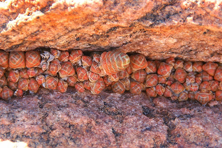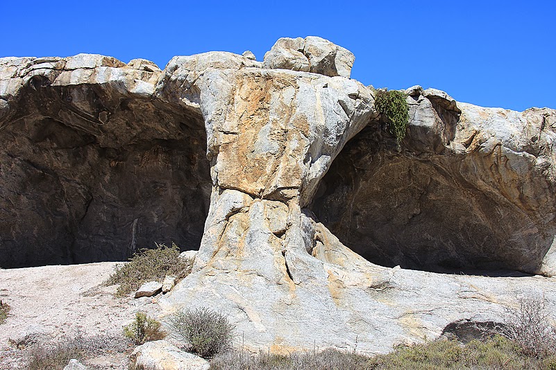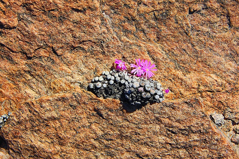 Eine angenehme Nacht liegt hinter uns: es war erfrischend kühl, aber nicht kalt, der Wind wehte leise und das Brandungsrauschen in seiner Regelmäßigkeit war sehr schlaffördernd. Trotzdem sind wir schon früh aufgestanden, denn wir wollen nichts verpassen. Nein, nicht dass hier die Mega-Action wäre, das nun nicht, aber es ist einfach schön, dem erwachenden Morgen am Meer zuzusehen. Heinz macht noch vor dem Frühstück einen Ausflug in die Felsen, um zu sehen, ob die Conophyten die Nacht gut überstanden haben… Dabei klettert er immer höher, bis er schließlich auf einem rundlichen Felsbrocken steht, von dem aus er Rundumsicht hat und ihm der Wind würzig um die Nase weht. Das löst in ihm anscheinend ein besonderes Gefühl von Wohlsein und Freiheit aus, denn, als ich ein undefinierbares, aber glücklich klingendes „Uuuuaaaaiiihhhaaa!“ vernehme und zu ihm hochblicke, steht er mit weit ausgebreiteten Armen dort oben und dreht sich mehrmals um die eigene Achse. So muss Urlaub sein! Während Heinz seine ganz persönlichen, luftigen Glücksmomente genießt, stöbert Jochen am Strand umher und wir beiden Frauen bereiten das Frühstück vor. Wenig später ist Heinz wieder von dem Felsen herabgeklettert, gerade rechtzeitig zum Essen, und nimmt mit uns am Tisch Platz, Jochen hingegen lässt etwas auf sich warten. Dann aber kommt auch er – mit einer Plastiktüte, prall gefüllt mit frischen Muscheln. Die gibt es heute Abend als Vorspeise! Ich freue mich, denn sie haben wirklich einmalig gut geschmeckt, noch mehr aber freue ich mich, dass sie heute den ganzen Tag Zeit zum Wässern haben.