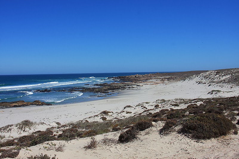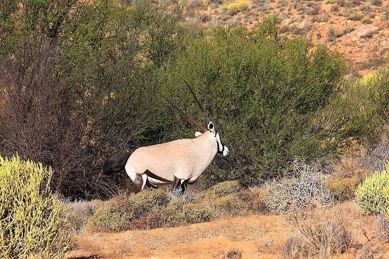Bestimmt eine halbe Stunde streifen wir durch die Dünenlandschaft und delektieren uns an der äußerst vielfältigen Flora. Doch wir sollten bald mal weiter fahren, denn es liegt eine recht lange Strecke vor uns, bis hinauf in den Nordosten, nach Skilpad. Und die verspricht interessant zu werden; am Gate hatten wir ein kleines Heftchen erhalten, in dem die sehenswertesten Stationen vermerkt sind und alleine, wenn wir ein paar von denen abklappern, sind wir schon gut beschäftigt. Ganz zu schweigen von den Dingen, die wir selbst noch zu entdecken hoffen. Also, nix wie rein ins Auto und weiter!