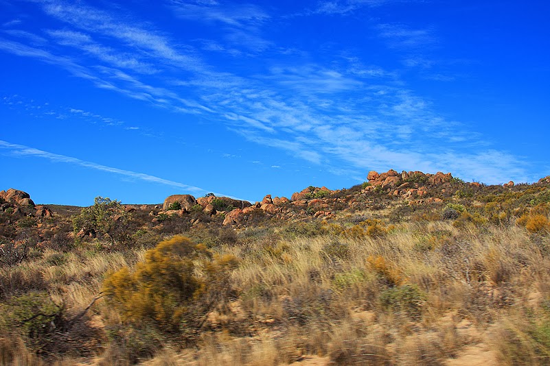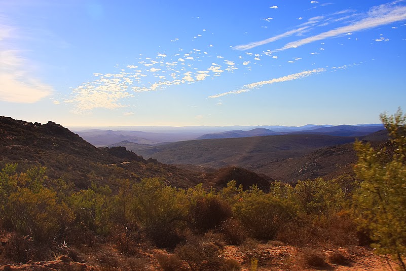 Das Riethuis-Gebiet steht zwar dem Richtersveld, wie wir sehen konnten, eigentlich in nichts nach, leidet aber etwas unter unserem Zeitdruck. Der schränkt unseren Bewegungsradius bedauerlicherweise so ein, dass wir eben nur diesen einen Hügel erkunden konnten. Wer weiß, was da noch alles auf und hinter den anderen Erhebungen verborgen liegt… Doch nächstes Jahr werden wir wohl wieder hier sein und dann planen wir es so, dass wir hier etwas mehr Zeit zum Rumstromern haben. Jetzt streichen wir halt zwangsweise die Segel, ein wenig wehmütig zwar, jedoch durchaus einsichtig. Unsere Freunde danken es uns, begrüßen uns freudig und verfrachten uns ins Auto, das zur Weiterfahrt bereit steht. Tja, welchen Weg nehmen wir jetzt? Den langen über den nördlichen Teil des Parks oder die östliche Abkürzung über Soebatsfontein, außerhalb der Parkgrenzen? Ein Blick auf die Uhr enthebt uns jeglicher Entscheidung: es ist schon relativ spät und gerne möchten wir vor Einbruch der Dunkelheit in unserem heutigen Quartier ankommen. So also nehmen wir an der nächsten Gabelung die östliche Tangente, verlassen den Park und kurven zügig über privates Farmland. Landschaftlich verändert sich hierbei wenig, dennoch ist es unglaublich, wie sehr die Flora ganz offensichtlich unter der Bewirtschaftung leidet: wir sehen keine Rinder, keine Ziegen oder sonstiges Getier, das dem Farmer Geld einbrächte, trotzdem aber ist die Vegetation „platt“. Gut, wir steigen nicht aus und haben keine Gelegenheit, das zu verifizieren, doch alleine der Blick aus den Autofenstern ist recht aufschlussreich: Felsen, Sand, Sträucher. Da blitzt nichts Verlockendes auf, nichts, gar nichts.