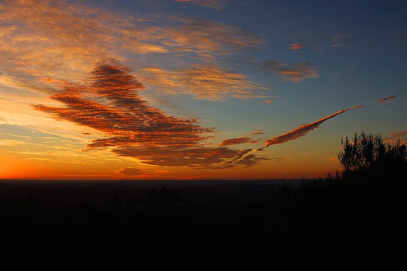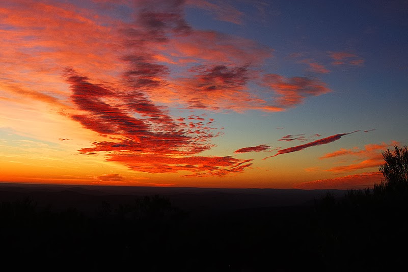 Der Ort Soebatsfontein selbst setzt dem Ganzen dann die Krone auf. Hier möchte ich nicht mal tot über dem Zaun hängen! Gut, es ist ein entlegenes Kaff, zudem umarmt von einem Nationalpark, das Klima ist harsch bis unfruchtbar – es ist also ein extrem strukturschwaches Gebiet. Trotzdem! Eine Strafe Gottes, hier wohnen zu müssen. Wir müssen das Gott sei Dank nicht – nein – wir dürfen heute wieder rein in den Nationalpark und unsere beiden gebuchten Bungalows in Skilpad, dem Hauptcamp, beziehen. Zwar wissen wir noch nicht, was uns da erwartet, doch es wird wohl besser sein, als das elende Kaff, das wir gerade hinter uns bringen! Ja, und so ist es. Kaum haben wir den Park erneut geentert, werden wir von einer Schar Erdmännchen begrüßt, die uns aus der Ferne, dennoch deutlich sichtbar, willkommen heissen. Hallo, ihr wuseligen Gesellen, schön, euch zu sehen! Rasch flitzt der Trupp weiter – wie auch wir. Kurz vor 17.00 Uhr treffen wir, nach einer kleinen Pass-Straße, dann endlich in Skilpad ein, erledigen die nötigen Formalitäten und nehmen anschließend sofort Kurs auf unsere gebuchten Chalets. Und diese rauben uns beinahe den Atem: da liegen vier dieser Häuschen auf einer Anhöhe, die einen weiten Blick in die bergige Landschaft dieses Parkteils ermöglicht. Die Sonne schickt sich soeben zu ihrem allabendlichen Untergang an und wir sind wie gefesselt: Hügelkette um Hügelkette staffelt sich hintereinander, schichtet sich in unglaublichen Farbabstufungen schwarzer, blauer und rötlicher Töne gen Horizont, sanft wogen lanzettblättrige Büsche wie Scherenschnitte vor dieser phantastischen Kulisse, eine Wolke formiert sich zu ständig wechselnder, immer unglaublicherer Gestalt. Irre!