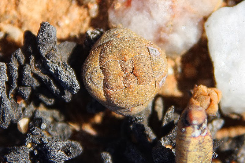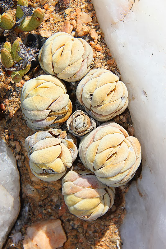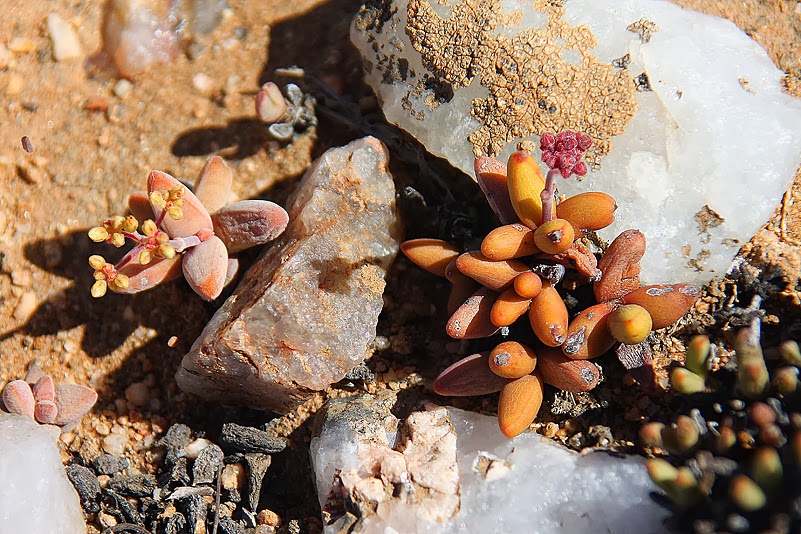 Im Prinzip reicht schon alleine der Begriff „Quarzfläche“ völlig aus, um unseren Puls zu beschleunigen und ein leichtes Rot der Vorfreude auf unsere Wangen zu zaubern. Diese Gebiete nämlich sind ganz besondere Standorte für ganz besondere Sukkulenten. Während das Umfeld solcher Flächen eher von strauchigen, aufrecht wachsenden Sukkulenten, Gräsern oder nichtsukkulenten Sträuchern bevorzugt wird, dominieren auf Quarzflächen die kompakten, bodennahen Blattsukkulenten. Studien haben ergeben, dass das unter anderem an ganz speziellen klimatischen Gegebenheiten liegt, deren Ursache in der Farbe der Quarzsteine begründet liegt. Die weißlichen Grusstücke nämlich beeinflussen die Temperaturentwicklung der bodennahen Luft und der Bodenoberflächen – somit also auch die Temperatur der Pflanzen selbst. Die reflektierenden Eigenschaften des Quarzes halten die bodennahe Luft um bis zu fünf Grad kühler als die angrenzender, nicht von Grus bedeckter Flächen. Die unmittelbare Bodentemperatur hingegen weicht im Vergleich dazu nur an heißen Sommertagen um ein paar Grad nach unten ab – im Winter jedoch ist sie um bis zu sechs Grad höher als auf quarzfreien Flächen. Zudem wirkt sich der Quarzbelag durch Herabsetzung der Evaporation und die Vergrößerung der Kondensationsfläche positiv auf den Wasserhaushalt des Oberbodens aus, sodass besonders Zwergpflanzen mit oberflächennahen Wurzeln von diesen Gegebenheiten profitieren. Eine Mini-Klimaanlage also, die ideale Wachstumsvoraussetzungen für die von uns so geliebten, gedrungen wachsenden Winzlinge – viele Endemiten inklusive – schafft.