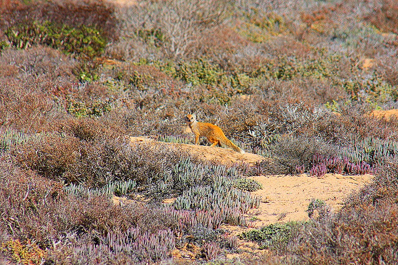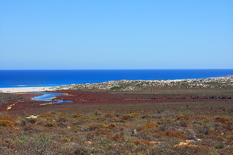 Als dankbare Gäste verabschieden wir uns und nehmen nun die nächste, die erste „offizielle“ Station ins Visier: „das malerische Spoeg-River-Estuary ist ein hervorragender Platz zur Vogelbeobachtung, insbesondere von Watvögeln. Die Höhle selbst stellt zudem einen historisch und kulturell bedeutenden Ort dar, an dem man über zweitausend Jahre alte Zeugnisse der frühen Schafhaltung sicherstellen konnte.“ Sagt das Heftchen. Naja, schaun wir halt mal. Über sandige Pfade kurven wir hinab zu dieser Flussmündung. Halt, halt, stopp! Was? Da steckte eine aufgespießte Maus in einem Busch! Echt?!? Ok, die Stelle merken wir uns für den Rückweg, es fährt sich so schlecht rückwärts auf diesem tiefsandigen Weg. Heinz und ich versuchen verzweifelt, uns die herausragenden Marker dieser bestimmten Stelle einzuprägen. 72, oder waren es 76 Kurven später – die Maus ist kurzfristig fast vergessen – nehmen wir erneut, nach einem größeren Bogen über Land, Kurs auf die Küste. Und die präsentiert sich hier so ganz anders als gewohnt. Es ist keine felsige Bucht mit Brandung, es ist kein Sandstrand, es ist keine Steilküste – nein, es ist das Delta des kleinen Flusses Spoeg. Der Spoeg River bildet ein flaches Schwemmtal, mehrarmig, natürlich nicht vergleichbar mit dem Delta einer Donau oder Wolga. Dennoch ist der Anblick einzigartig: ein Flusskegel, wasserführend und von tiefem Blau, ergießt sich in einen türkisfarbenen Streifen am Rande des Atlantischen Ozeans und seine Gestade sind gesäumt von tiefroten, fahlroten, braunen und grünen Streifen farbenfroher Vegetation. Wie das Werk eines phantasiereichen Malers liegt diese Flussmündung vor uns. Es ist unglaublich! Je näher wir der Mündung allerdings kommen, desto mehr verschmelzen die einzelnen Farben, desto diffuser wird das Landschaftsgemälde. Dafür aber kann man endlich auch erkennen, welche Pflanzen für diese tiefe, intensive Rotzeichnung verantwortlich sind: Sarcocornias. So etwas hatten wir bereits in der Knersvlakte gesehen, winzig – hier jedoch sind die außergewöhnlichen Pflanzen mächtig, strotzend, groß, zahlreich und wahnsinnig dominant.