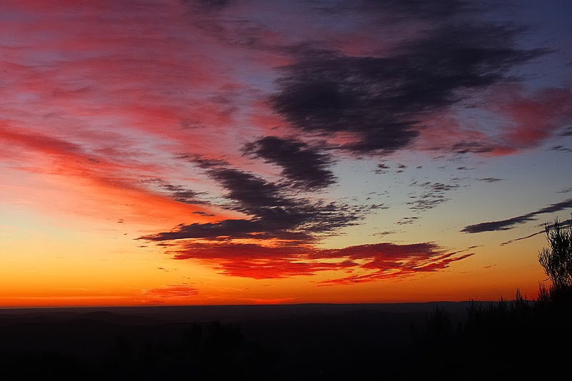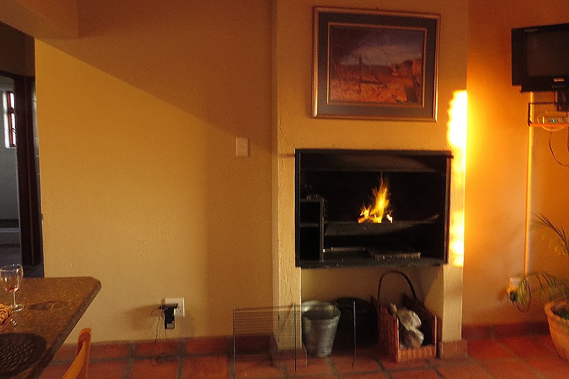 Wir verteilen uns rasch auf zwei der Chalets, haben jedoch kaum einen Blick für deren Interieur – was wir aber sehen, ist Luxus pur – und treffen uns anschließend erneut, bei Annette und Jochen, um diesen Moment bei einem gemeinsamen Abendessen zu zelebrieren. Das allerdings müssen wir selbst kochen – trotz des uns umgebenden Luxus’. Zwar gibt es hier auch ein Restaurant – das jedoch hat, wie wir schon bei unserer Ankunft feststellen durften, wegen Renovierung geschlossen. Doch als geübte Selbstversorger haben wir natürlich genügend Verpflegung dabei – sogar so (angeblich) urdeutsches Gemüse wie Weißkohl. Ein ganzer Kopf davon schaukelt seit einigen Tagen in unserem Laderaum herum und möchte allmählich seiner Bestimmung zugeführt werden. Was aber machen wir daraus? Heinz steckt seinen Kopf prüfend in den Kühlschrank im Auto und zieht triumphierend ein Päckchen Schinkenspeck hervor. Wir kreieren lauwarmen Krautsalat! Eifrig machen Heinz und ich uns ans Schnibbeln und Zubereiten, während Jochen schon mal den Indoor-Grill anheizt: ein mehrrostiger Feuerplatz, mitten im Wohnzimmer, eingelassen im Kamin – Beleuchtung inklusive! Diese Chalets sind wirklich vom Feinsten: die Küche hervorragend ausgestattet, die Möblierung geschmackvoll-gemütlich, der Sanitärbereich gepflegt und großzügig, ihre Lage ideal; das Beste aber ist definitiv eine dem Sonnenuntergang zugewandte, voll verglaste Terrasse, deren Fenster und Türen sich komplett zur Seite schieben lassen. Auf diesem Panorama-Freisitz decken wir nun liebevoll den Tisch und genießen in aller Ruhe das Farbenspiel des verglühenden Tages; der lecker duftende Krautsalat kühlt indessen gemächlich ab, das Feuer im Kamin brennt zur Bilderbuch-Grillglut herunter und wir knipsen uns derweil die Finger wund… Als der letzte Schein des Sonnenballs schließlich am Horizont verloschen ist, hält die Kühle der Nacht Einzug, die wir aber kurzerhand durch das Verschließen der Terrassenverglasung aussperren und so ein königliches Dinner in kuschelig-warmem Ambiente zu uns nehmen können. Ein perfekter Ausklang für einen ereignisreichen, nicht weniger perfekten Tag!
