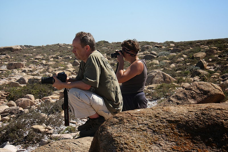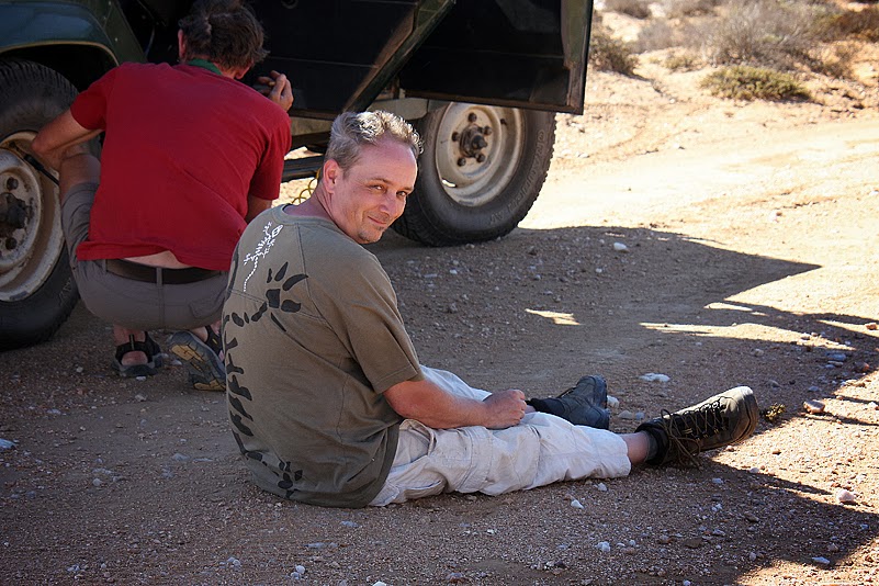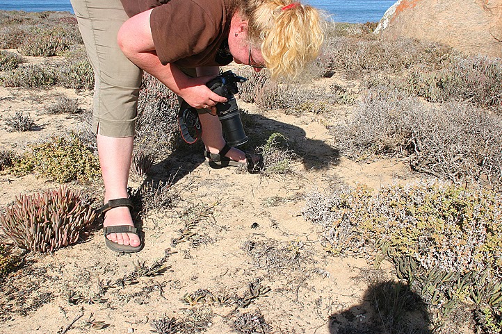 Doch als ich nach dem Frühstück mit einem Behältnis frischen Wassers vom Meer zurückkomme, hat Jochen die Schalentiere bereits wieder im Potjie versenkt und schmeckt soeben mit verzücktem Blick den Sud ab. Meine Verzückung hingegen hält sich in Grenzen – zu deutlich noch spüre ich den Sand von gestern Abend zwischen meinen Zähnen. Auch Annette wirft ein vorsichtiges „Wässern hätte aber nicht geschadet“ in die Runde, aber Jochen hält eine Entsandung für unnötig – wofür es jetzt ohnehin zu spät ist. Da wird sich vor allem Heinz sehr freuen, denn er hatte besonders schwer am Sand geschluckt! Momentan jedoch er kann kein Statement dazu abgeben, denn er ist schon wieder in den Felsen verschwunden und sucht nach Pflanzen. Seufzend mache ich mich derweil an den Abbau unseres Zeltes und verstaue anschließend mit Annette unseren Kram in den Kisten, während unsere Männer fröhlich ihren Leidenschaften frönen. Zum Aufladen jedoch sind alle wieder versammelt, rasch sind auch die letzten Dinge in den Wagen gepackt und wir fahren los.