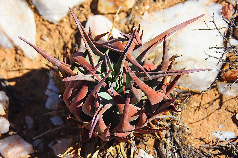 Während ich derartigen Gedanken nachhänge, erreichen wir bereits ein weiteres Farmhaus, das allerdings schon vor längerer Zeit aufgegeben wurde. Unter ähnlichen Umständen? Ich weiß es nicht. Was ich aber weiß, weil das Heftchen es kurz beschreibt: hier müssen wir uns links halten, um „das Kernland des sogenannten Riethuis Quarz“ zu erreichen, das eine einmalige, seltene Flora sukkulenter, quarzaffiner Pflanzen beherbergt. Musik in unseren Ohren!