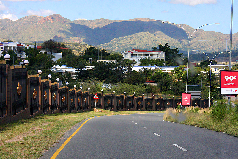 Der neue Morgen empfängt uns schon wieder mit Nieselregen, das Dach unseres Gartenhäuschens leckt mittlerweile und die Sitzpolster der campeigenen Stühle sind so durchnässt, dass wir uns genötigt sehen, das Frühstück anderswo einzunehmen. Mit allem Nötigen bepackt, ziehen wir unter den Vorbau des Sanitärgebäudes, wo es leidlich regengeschützt ist. Dort verzehren wir rasch unser Morgenmahl, bevor wir uns an die unangenehme Aufgabe machen, die vollgesogenen Zelte abzubauen. Schwer nur wollen sie in ihre Packsäcke rutschen, wiegen gefühlte Zentner und sind deshalb auch nur mit Mühe aufs Autodach zu hieven. Doch schließlich ist alles verstaut und wir treten unsere letzte Etappe Richtung Windhoek an. Wechselvolles Wetter begleitet uns, doch je weiter wir nach Süden vordringen, desto sonniger wird es. Zwar dräuen hier und da noch dunkle Wolken, aber sie regnen nicht ab – zumindest nicht direkt über uns. Gen Mittag bereits erreichen wir trockenen Reifens Namibias Hauptstadt und steuern nach deren Durchquerung direkten Weges sofort den Schnitzermarkt beim Eros Airport an. Dort hatte ich vor zwei Jahren mein 10-Kilogramm-Lieblings-Nilpferd Jacob erworben. Nun hoffe ich natürlich erneut auf „fette“ Souvenir-Beute – nicht nur, weil ich ja noch Heinz’ Geschenkversprechen offen habe, sondern auch aufgrund unerklärlicher, urzeitlicher Jäger- und Sammlertriebe. Kein Urlaub ohne Andenken. Das schaffe ich einfach nicht.