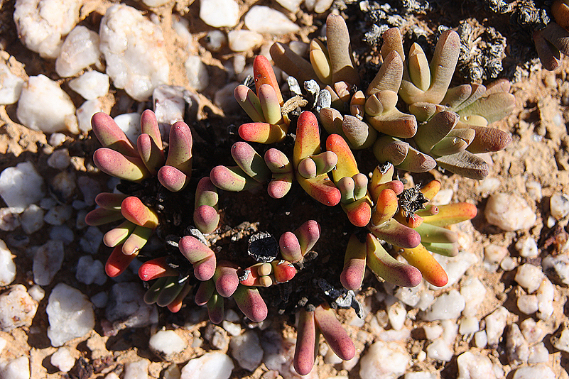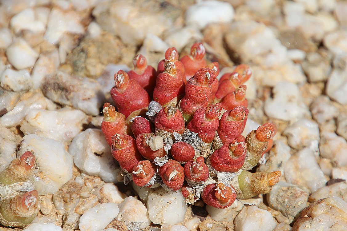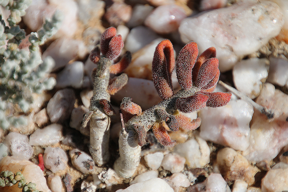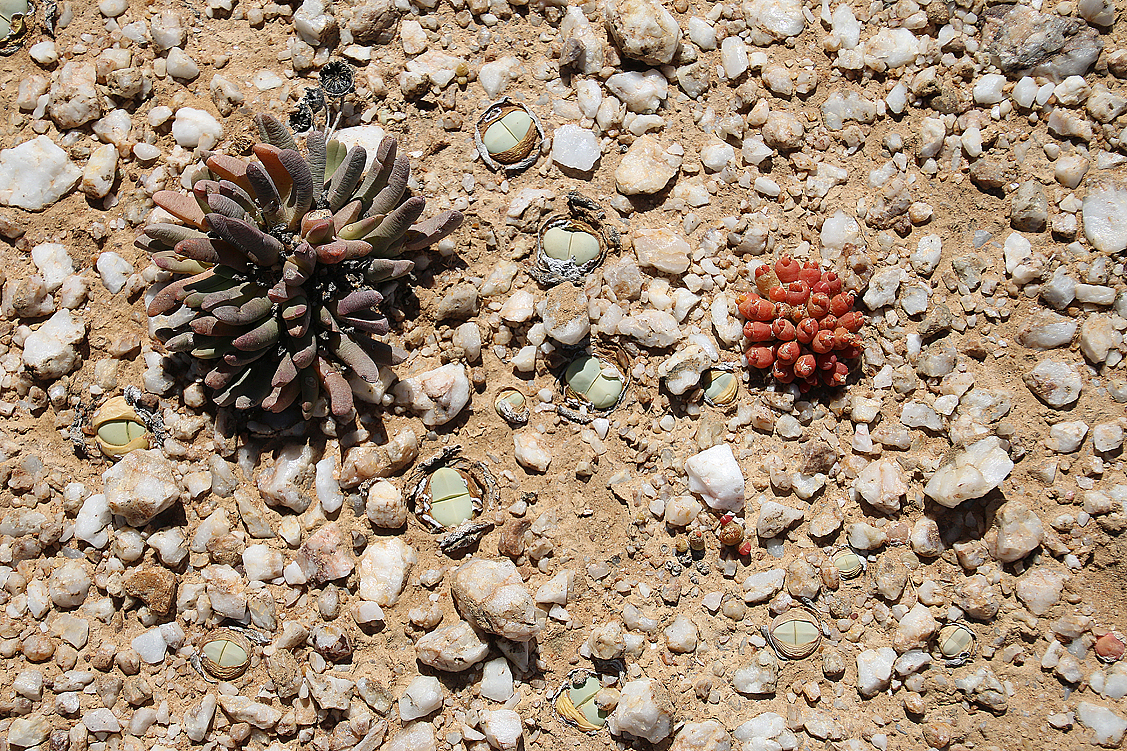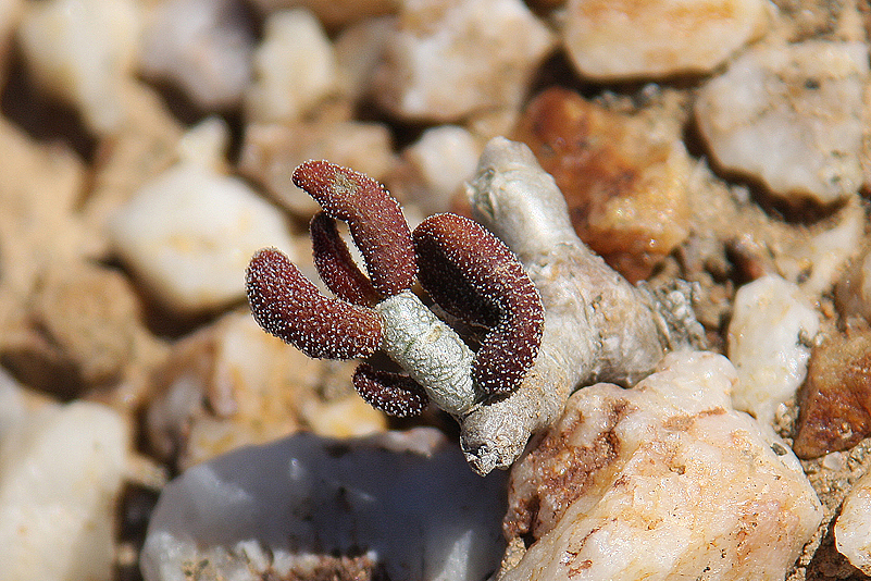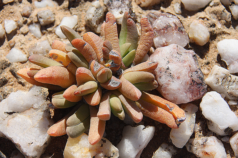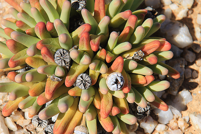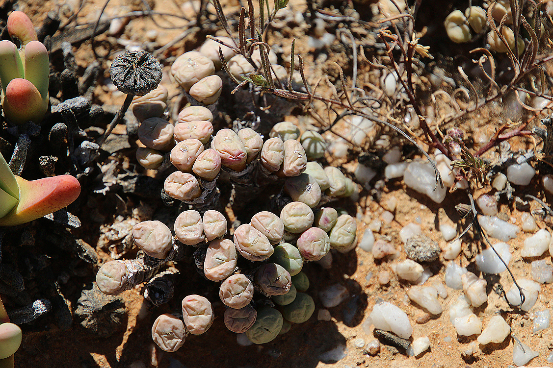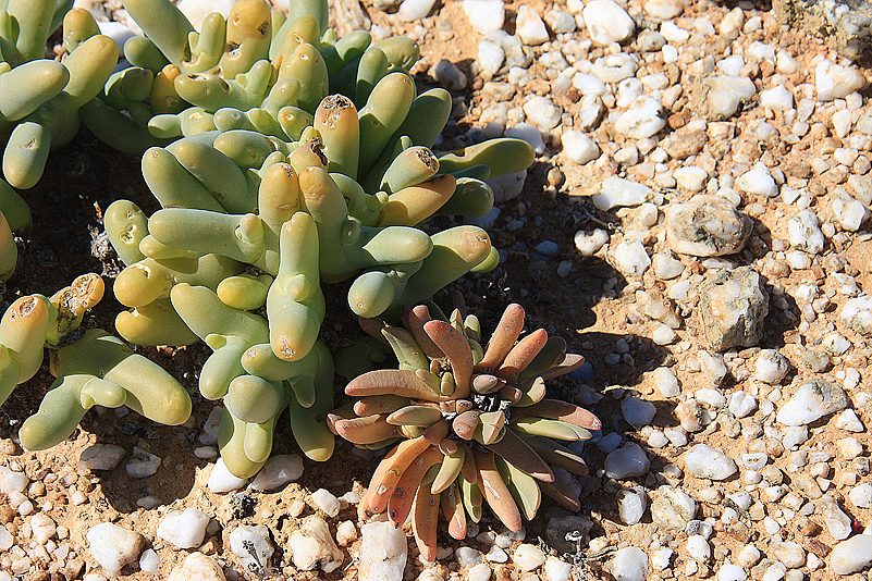 Mei, ist das schön, all die alten Bekannten, sprich Pflanzen, wiederzusehen. Leider ist zwar auch heuer kein Blütenmeer in Sicht, dafür sind wir einfach zu spät dran, aber trotzdem gibt es viel zu entdecken. Viele Pflanzen, die letztes Jahr schon „geschlafen“ hatten, also bis auf kaum sichtbare Reste auf Bodenniveau eingeschrumpelt waren, strotzen heuer prall, frisch und in den schönsten Farben. Da ist zum Beispiel Oophytum nanum, dessen zweigeteilte Blätter in allen Rottönen leuchten, winzige Tylecodons mit braunroter Belaubung, Argyroderma delaetii in pastelligem Mintgrün und appetitlichem Apricot und etwas, was wir auf unserer letzten Tour gar nicht gesehen hatten: Dactylopsis digitata. Diese Mittagsblumengewächse, die etwa zehn bis fünfzehn Zentimeter hoch werden und, by the way, gerade auch nur vereinzelt blühen, haben fingerförmige, zweigeteilte Blätter, die sich wie dicke grüne Würmer gen Himmel recken. Und diese Blätter haben ihnen auch ihren Trivialnamen eingebracht: Dead Man Fingers Plants oder Tote Finger-Pflanzen.